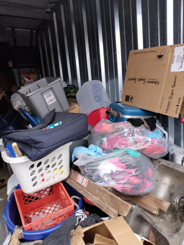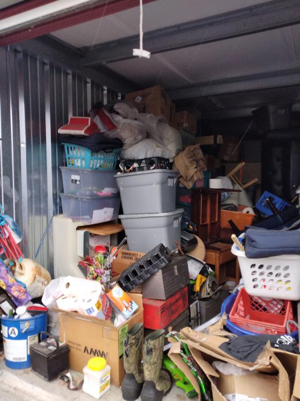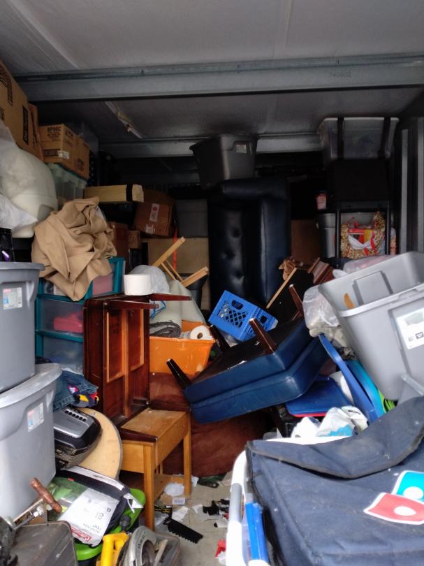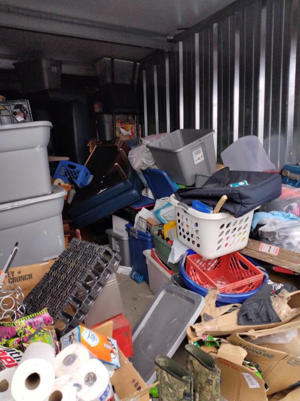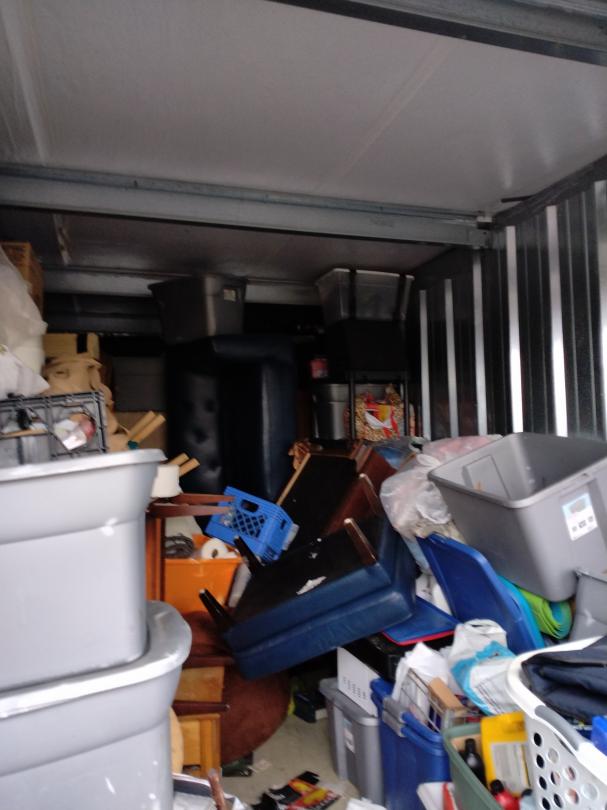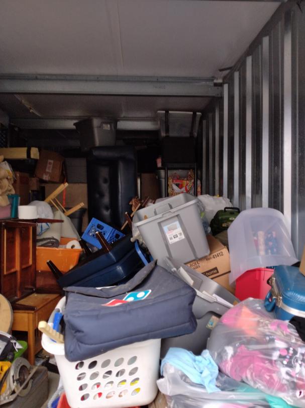 This unit appears to contain…Unit appears to contain chairs, a ladder, rugs, nightstands, a tool box, tools, a bean bag chair, a vacuum, a toy box, a subwoofer, a leather couch, a tent, kitchen utensils, hampers, baskets, a bed frame and boxes