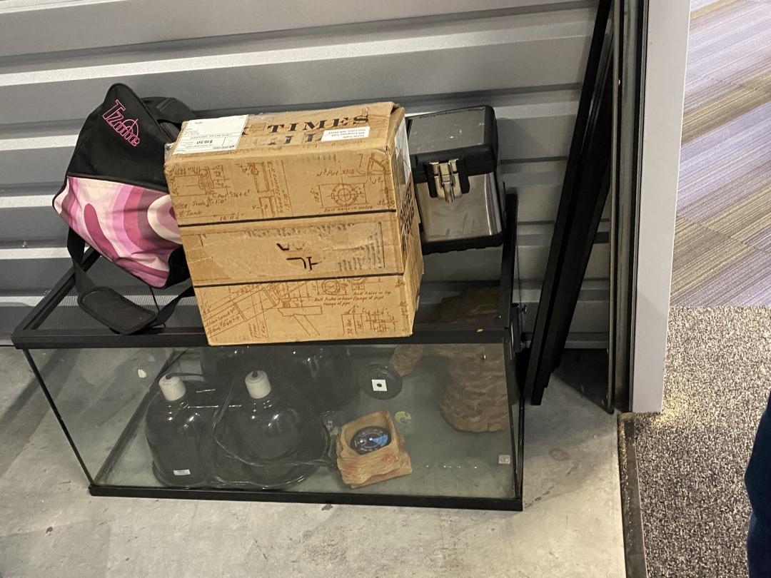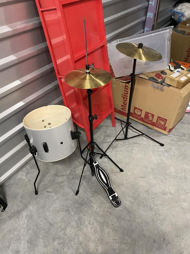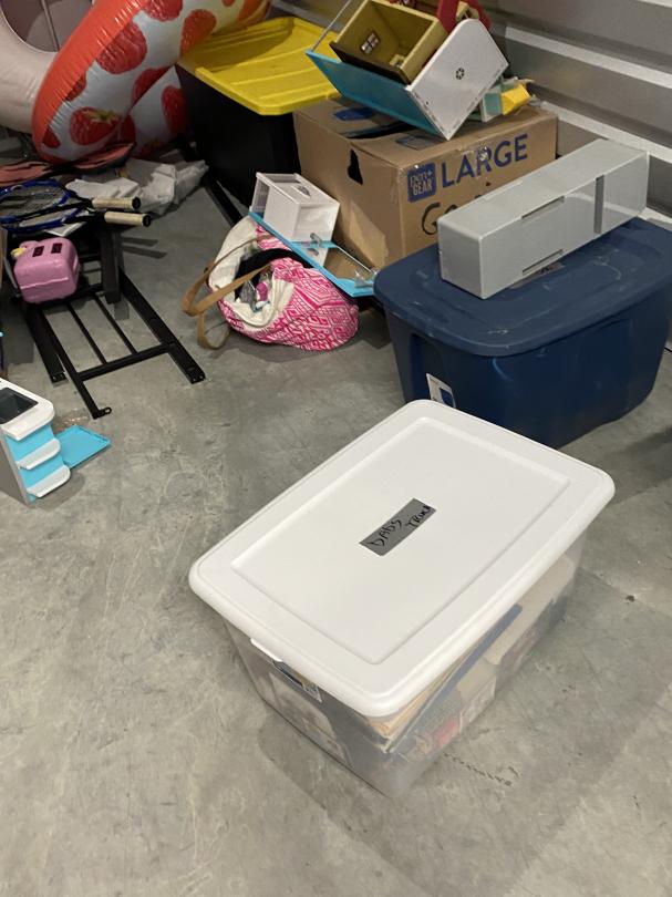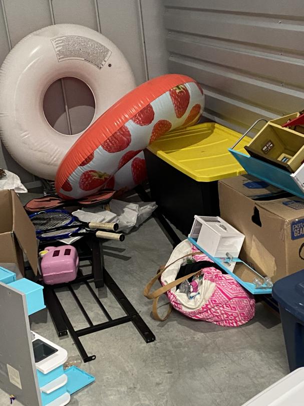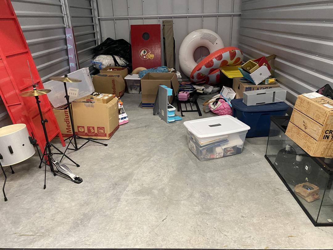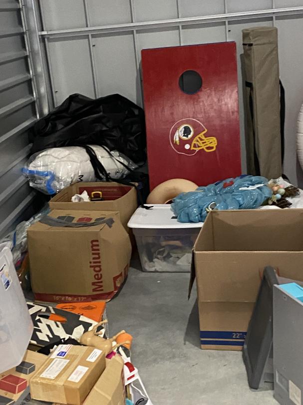 This unit appears to contain…Kids Drums, Boxes, Bins, Corn hole Game, Aquarium, Tool Box, Pool Toys, Sport Equipment, Bag, Skateboard