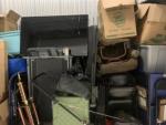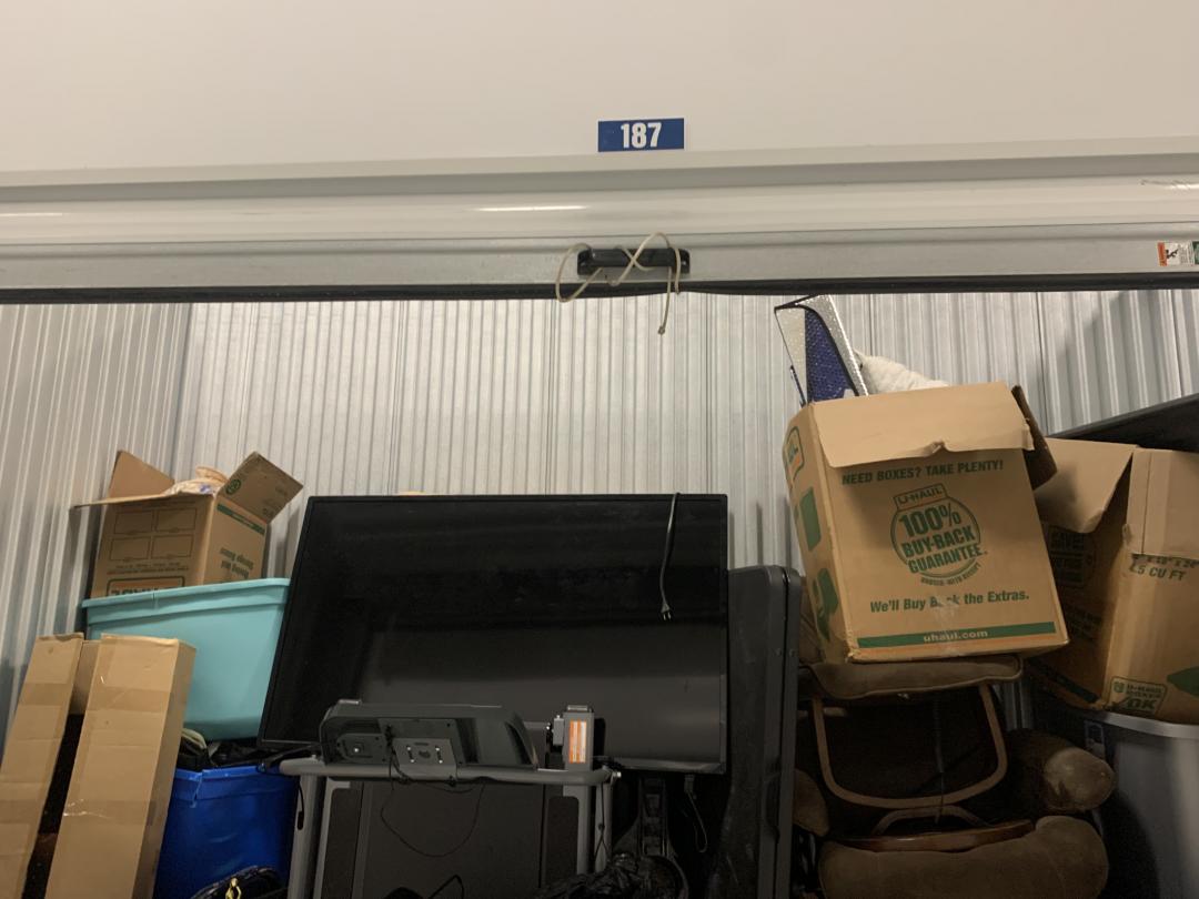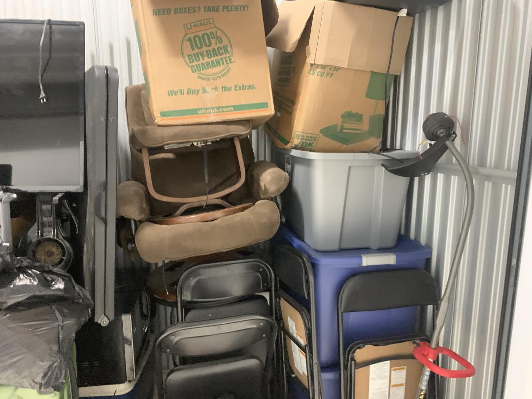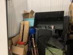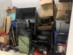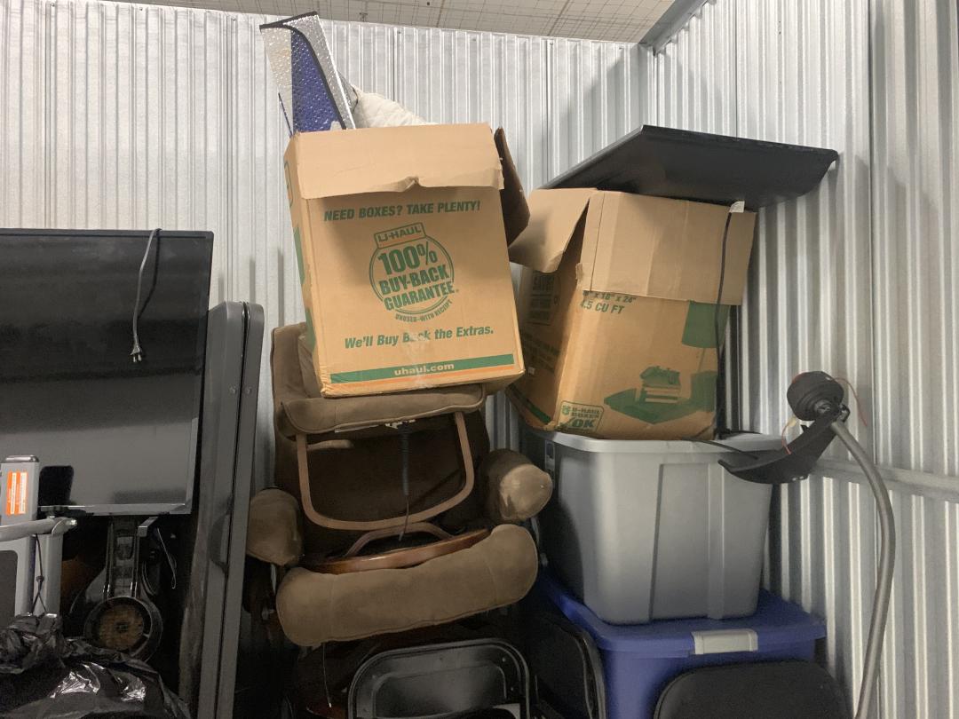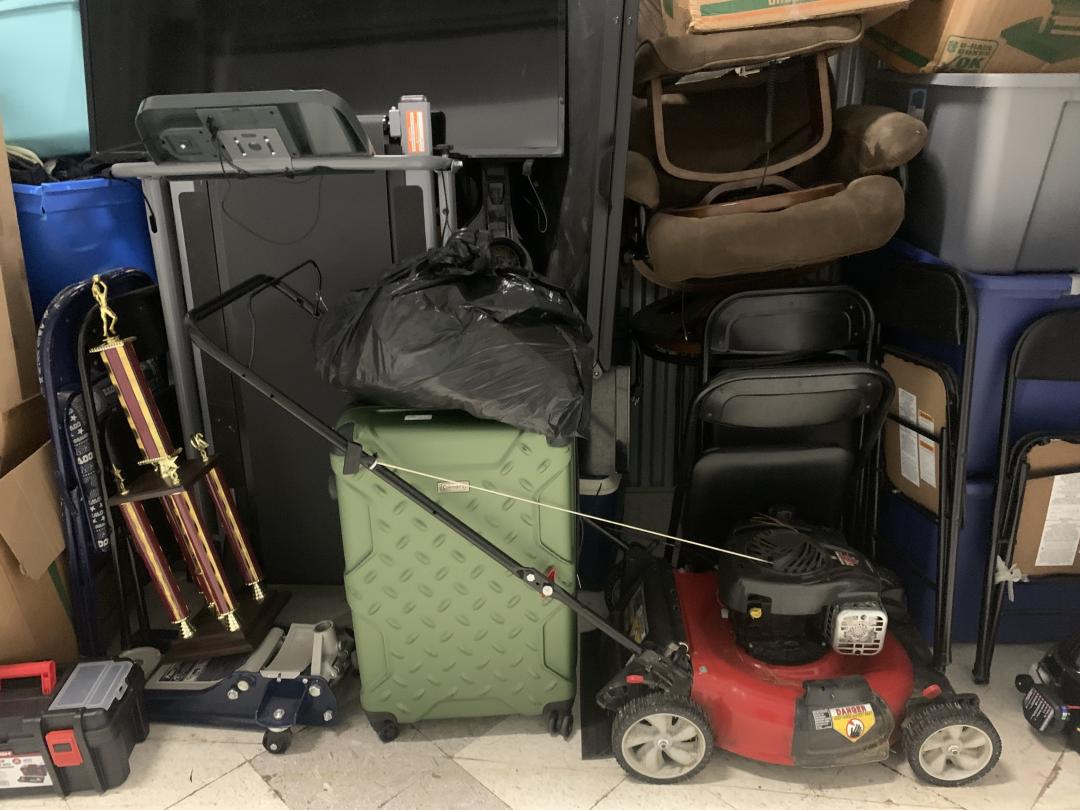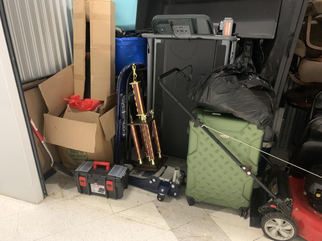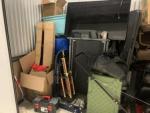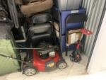 This unit appears to contain…Boxes, Bins, Exercise Equipment, Floor Jack, Tables, Weedeater