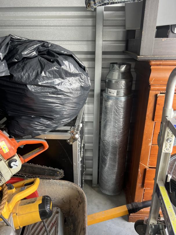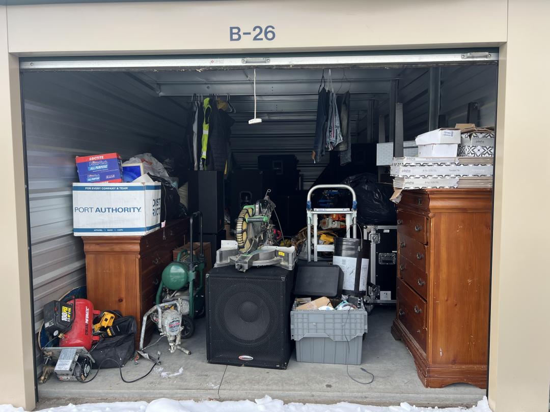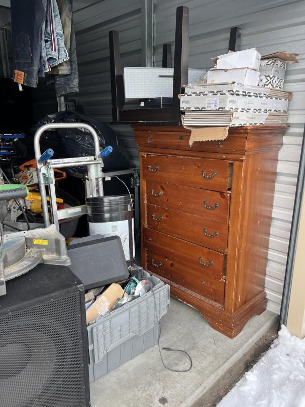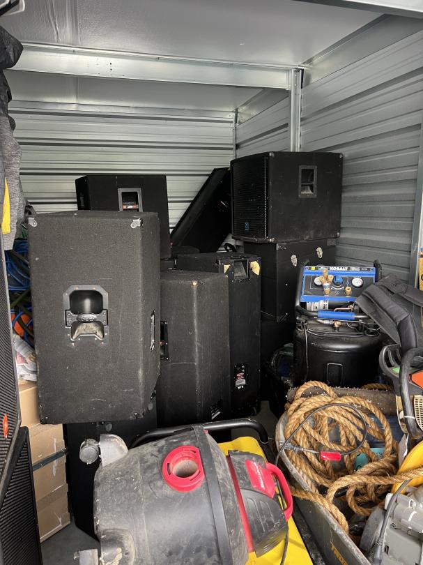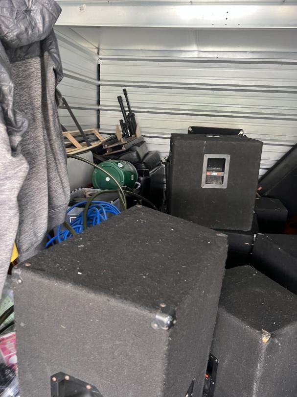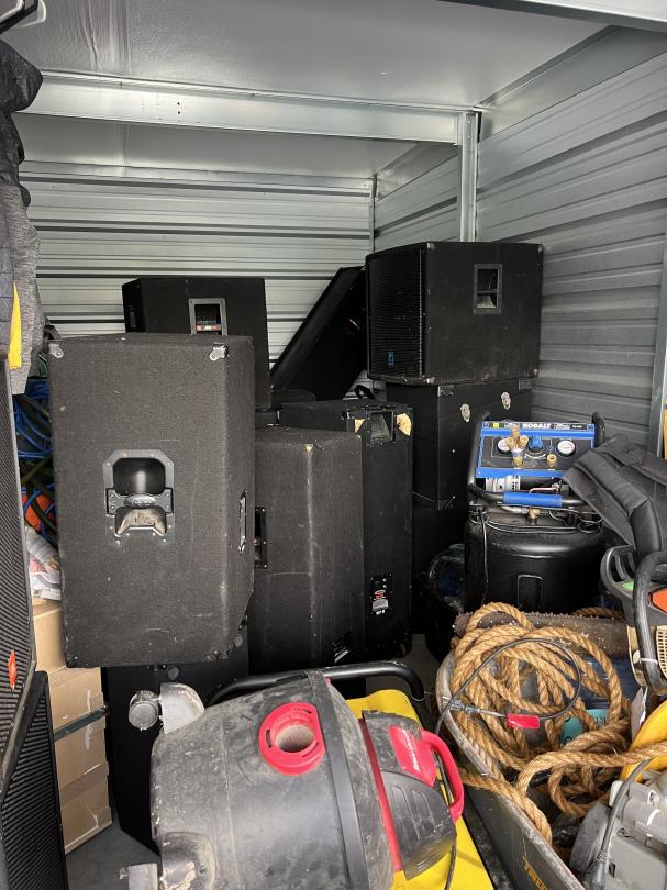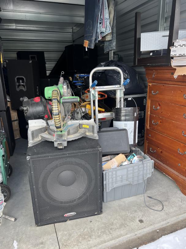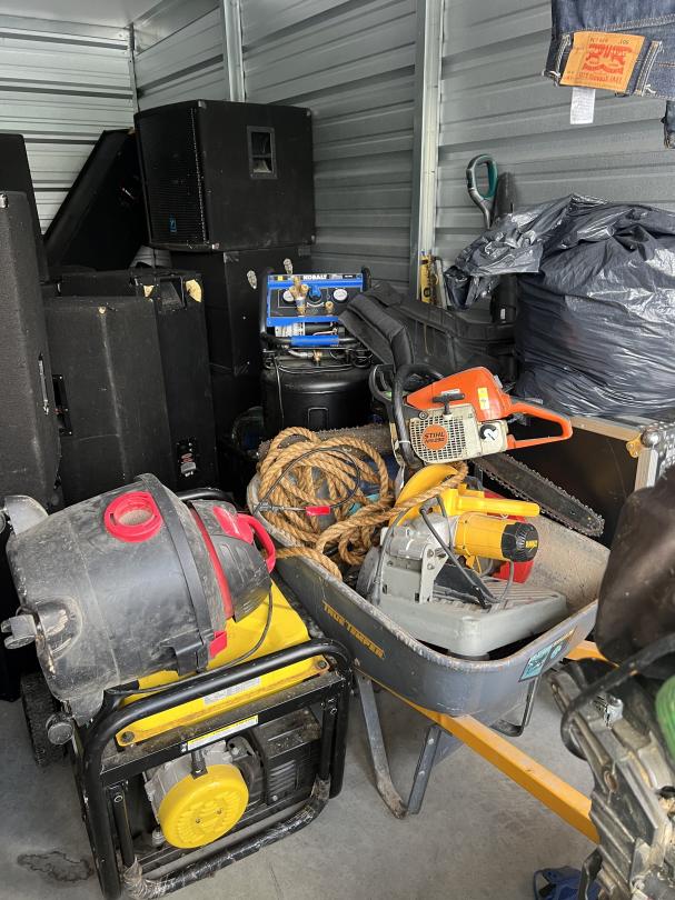 This unit appears to contain…Dressers, clothes, multiple large speakers, table saw, tools, wheel barrow, tubs, boxes, bags, table, shop vac, generator