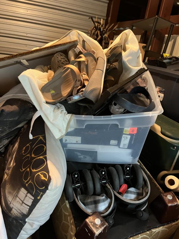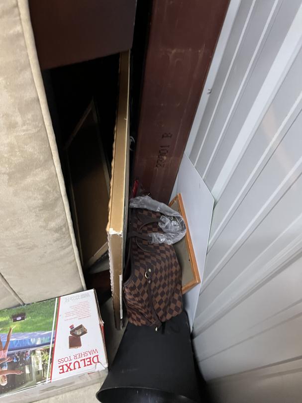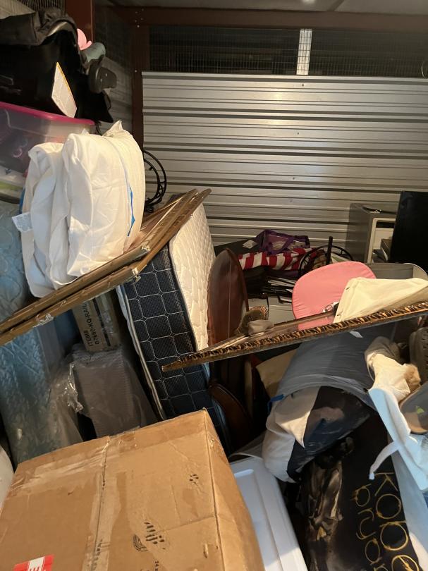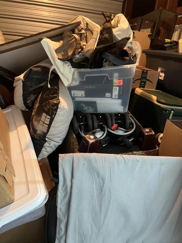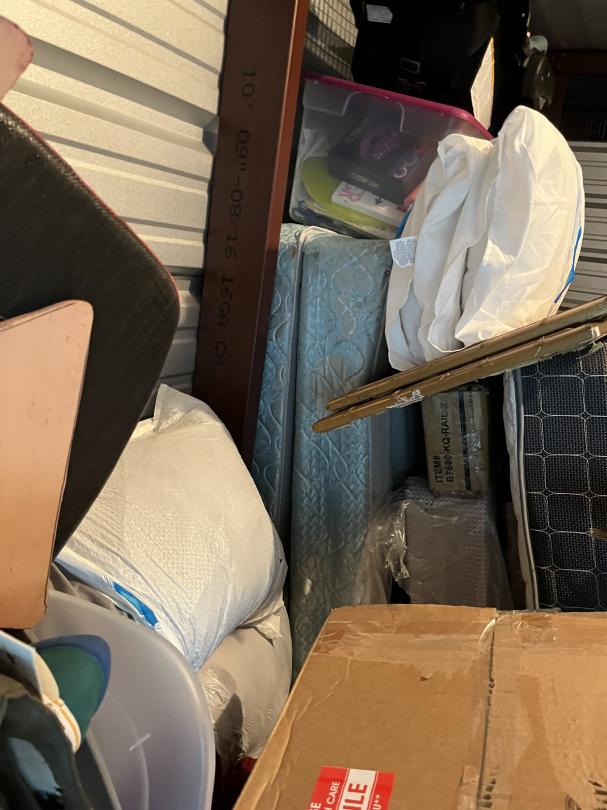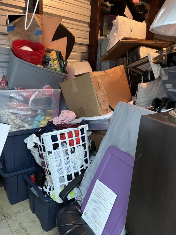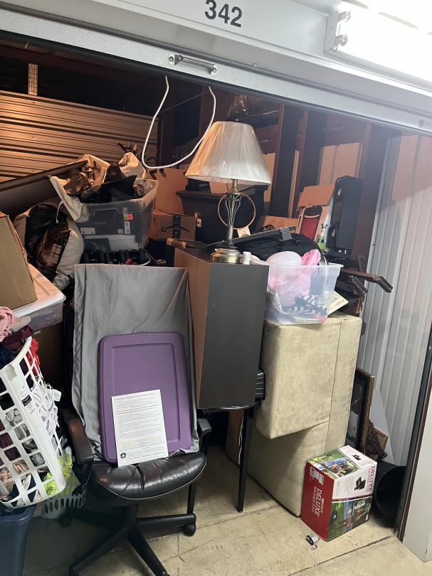 This unit appears to contain…clothes, lamp, couch, speaker, totes, ice chest, tv, end tables, pictures, bed rails, bead board, box springs, king mattress, stroller, flower vase