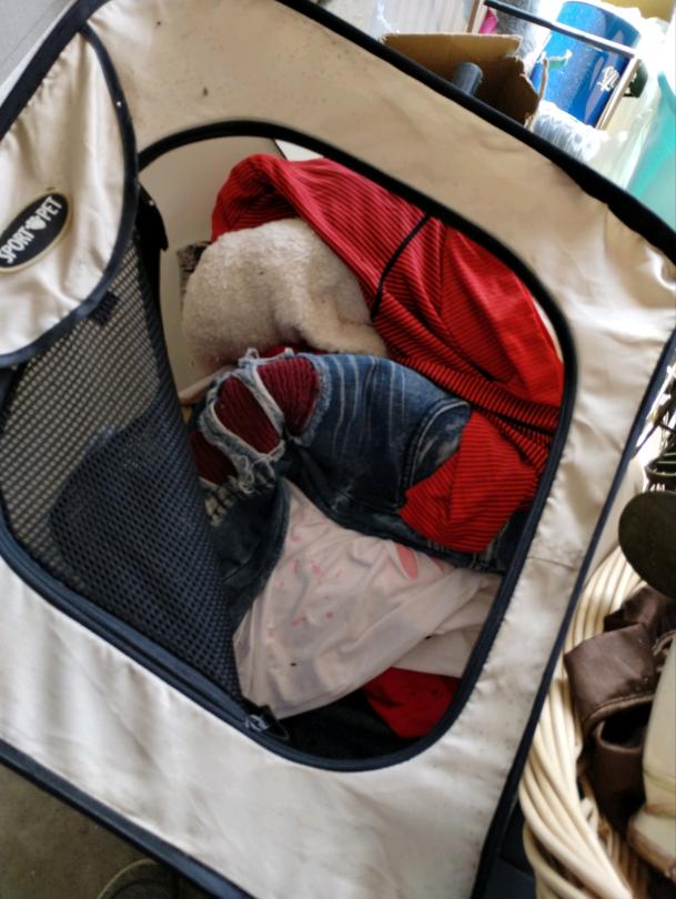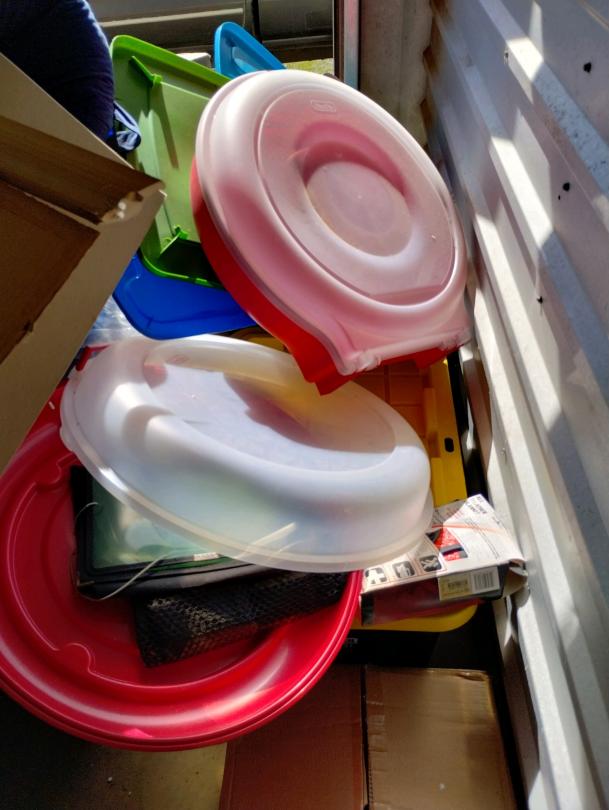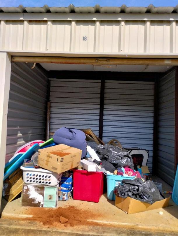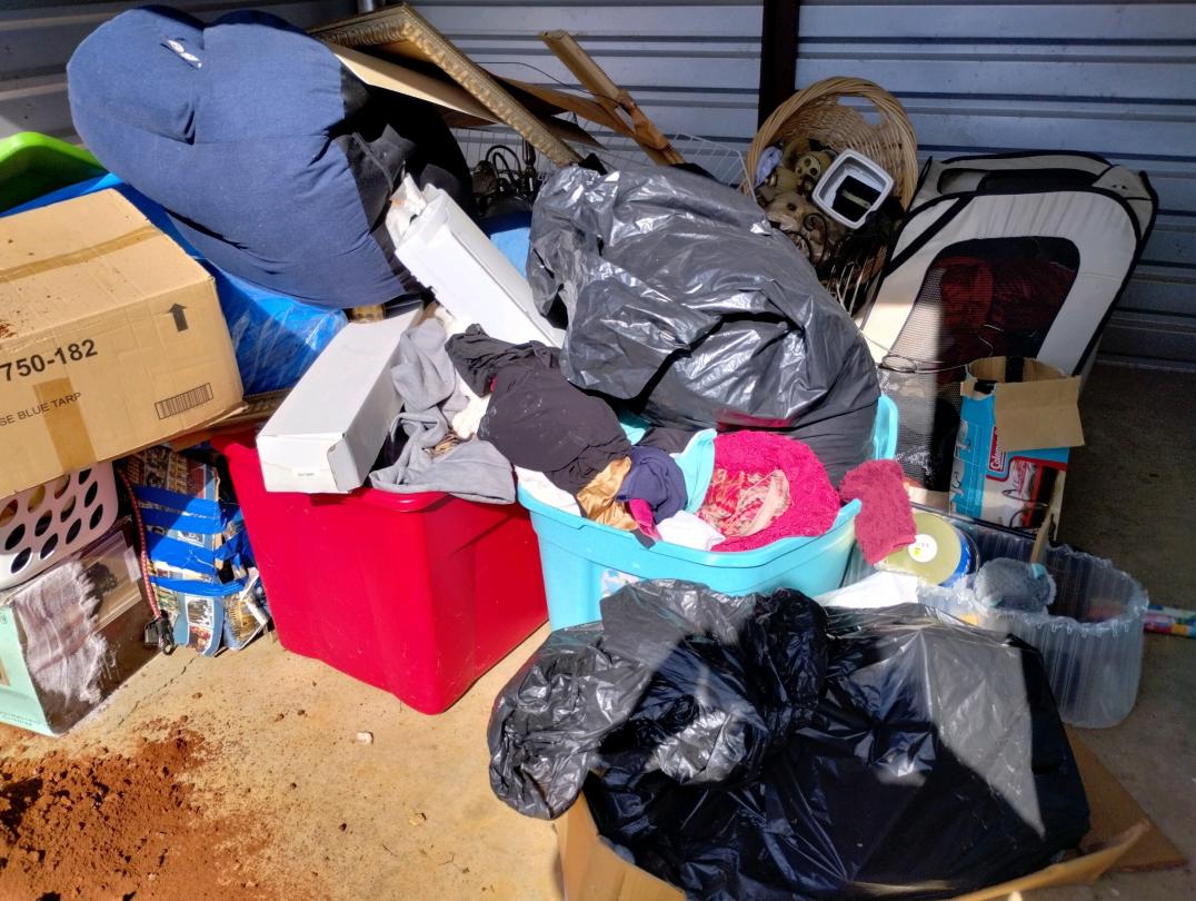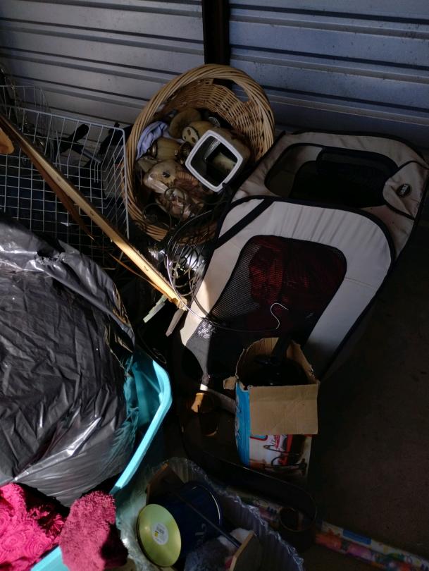 This unit appears to contain…Clothing, pictures, light fixture, bins, pillow, household items