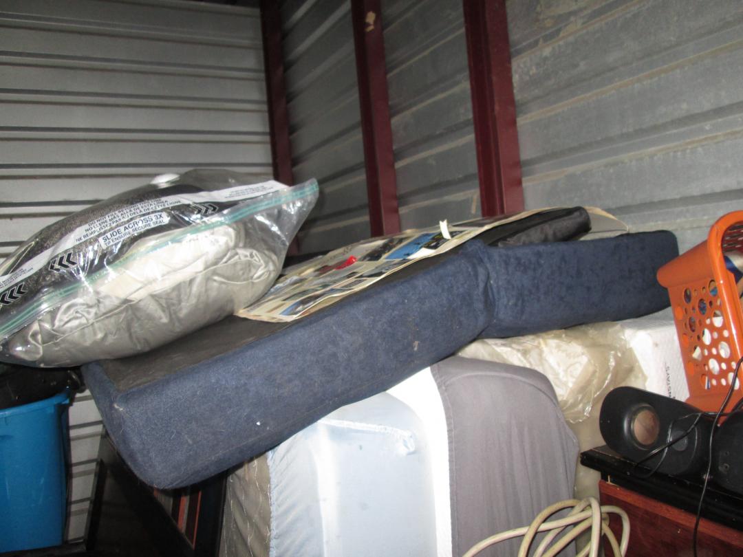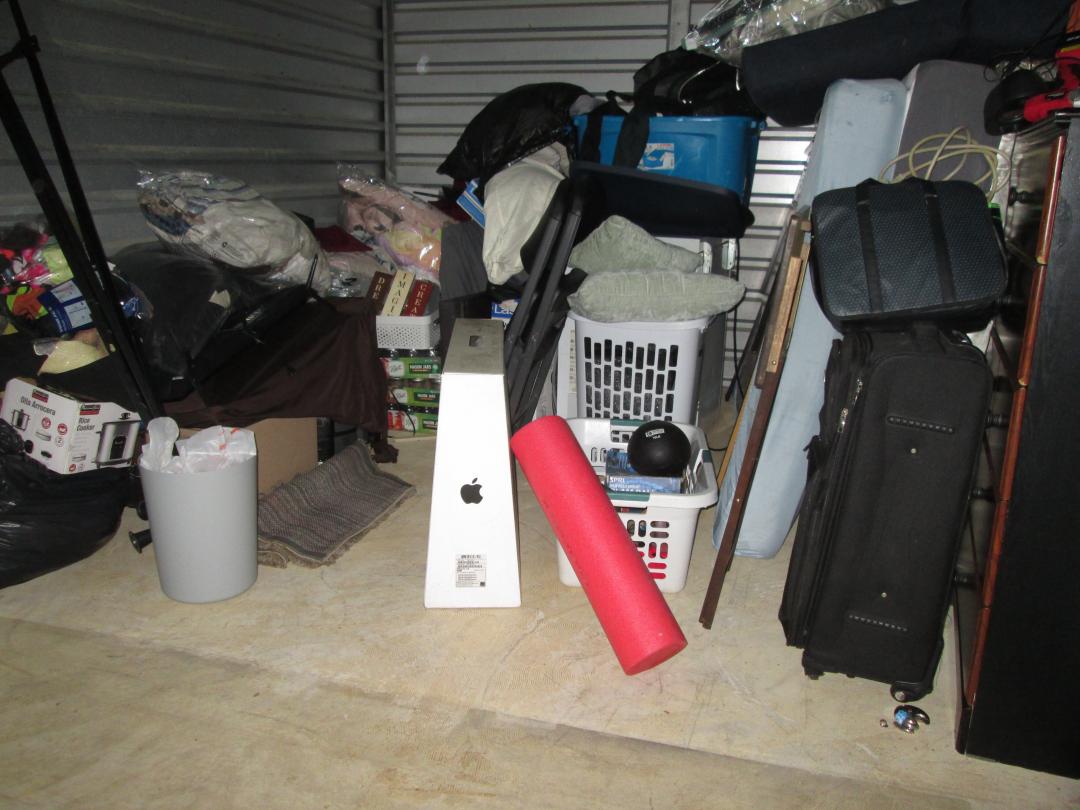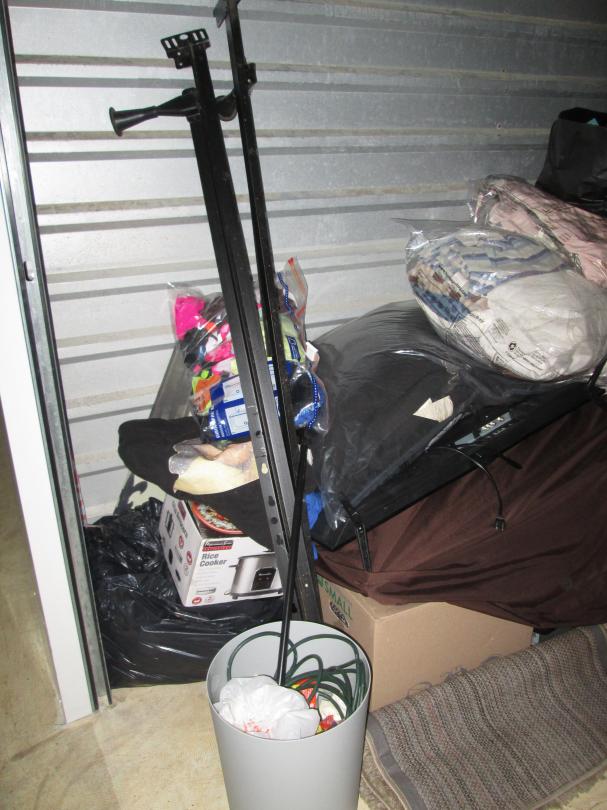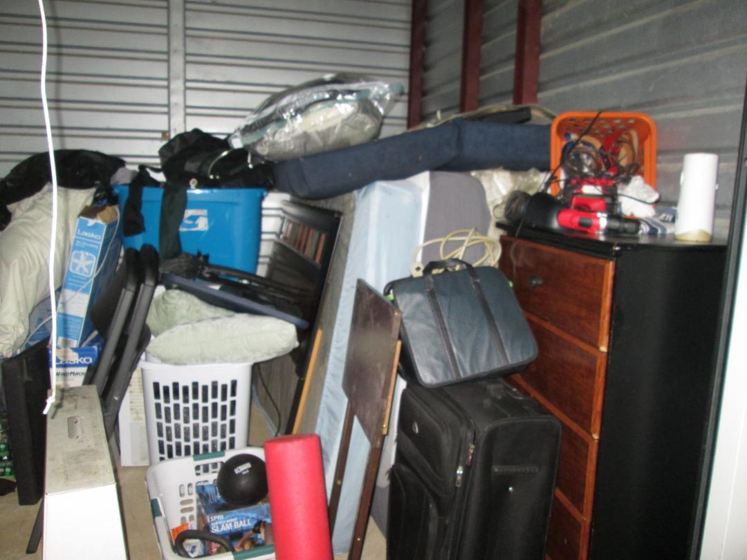 This unit appears to contain…This unit appears to contain: bags/totes, bed frame, box spring, cds, dvds, air fryer, mason jars - 3 boxes, clothing, shoes, kitchenware, dishes, dresser, fan, futon & mattress, deep freezer, crafts, headboard, mattress/bedding, power tools, mirror, rice cooker, kid basketball goal, wall art/pictures, tv, suitcase, workout equipment, apple computer