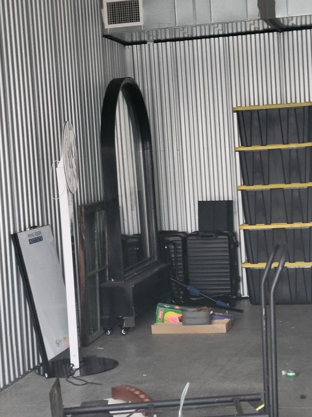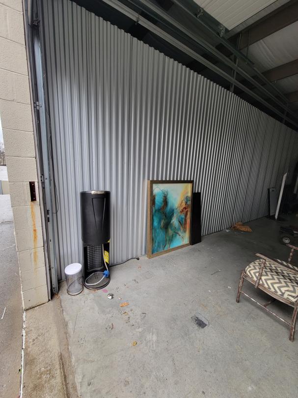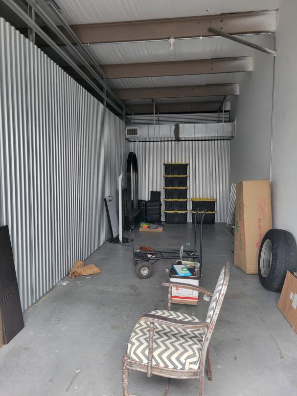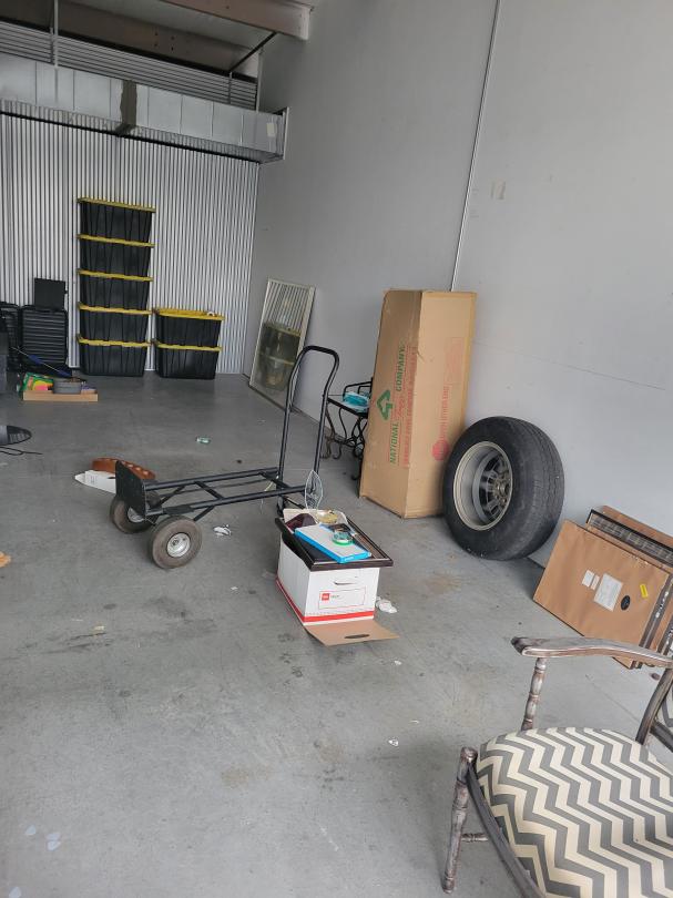 This unit appears to contain…Mirror, chair, photos, suitcases, boxes, wood, and dolly