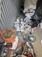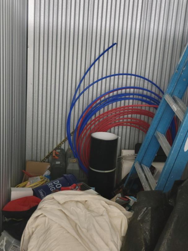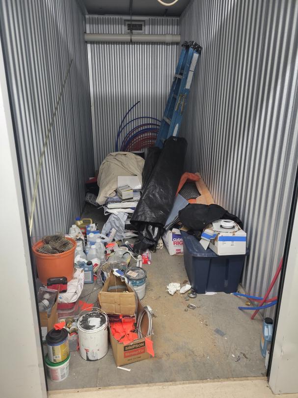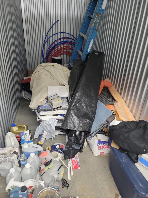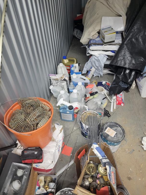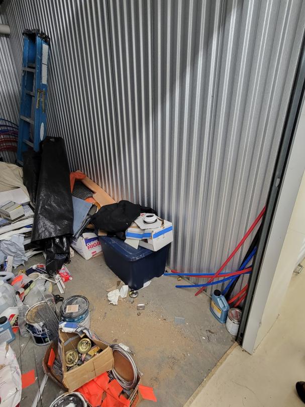 This unit appears to contain…Paint cans, cleaning supplies, knobs, ladder, tubes, tarp, and misc. items