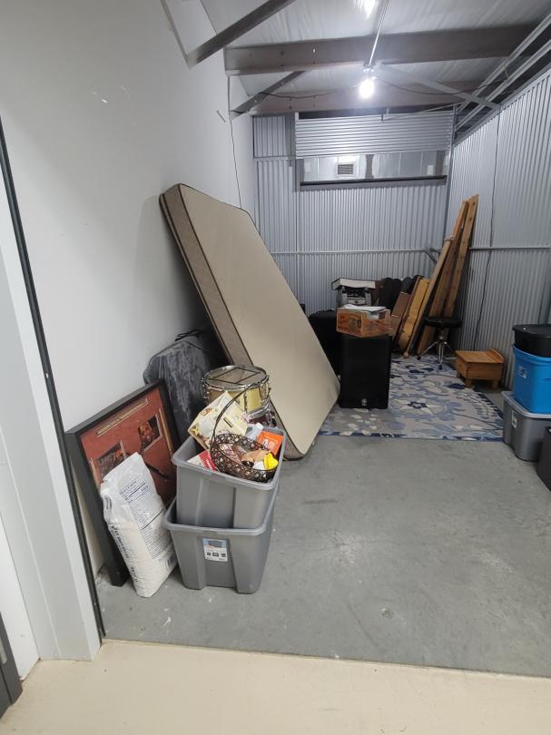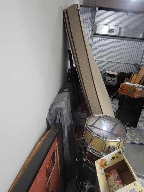 This unit appears to contain…tubs, tri-pod, mattress, rug, drums, speakers, car seats, headboard, guitar cases, misc.