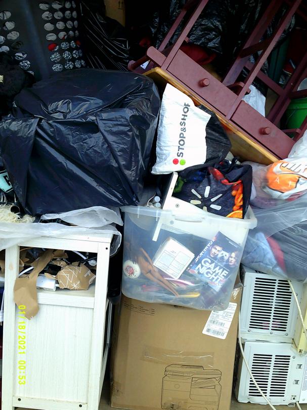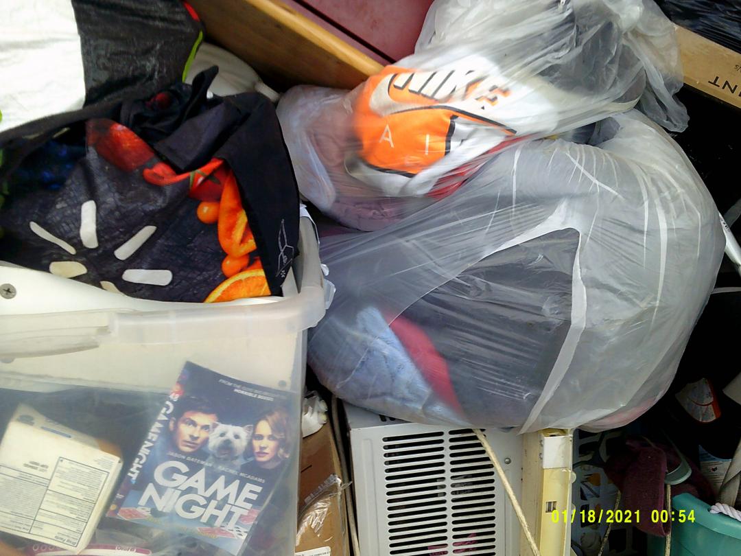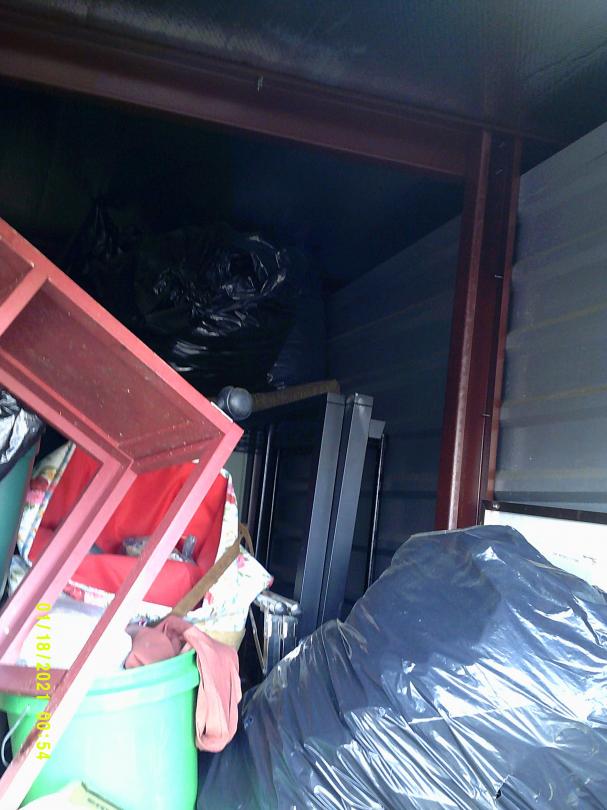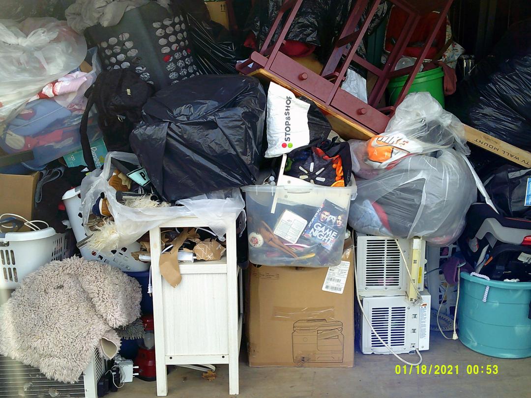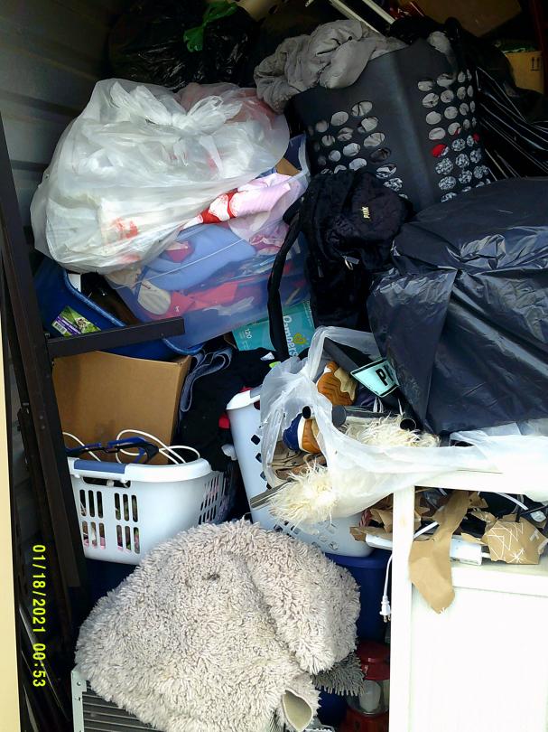 This unit appears to contain…READ ALL AUCTION RULES BEFORE BIDDING!!! Unit appears to contain: AC units, bed frame, car seat, cutting board stand, clothes, metal rack, cleaning supplies, totes, bags, boxes, DVD's, decor