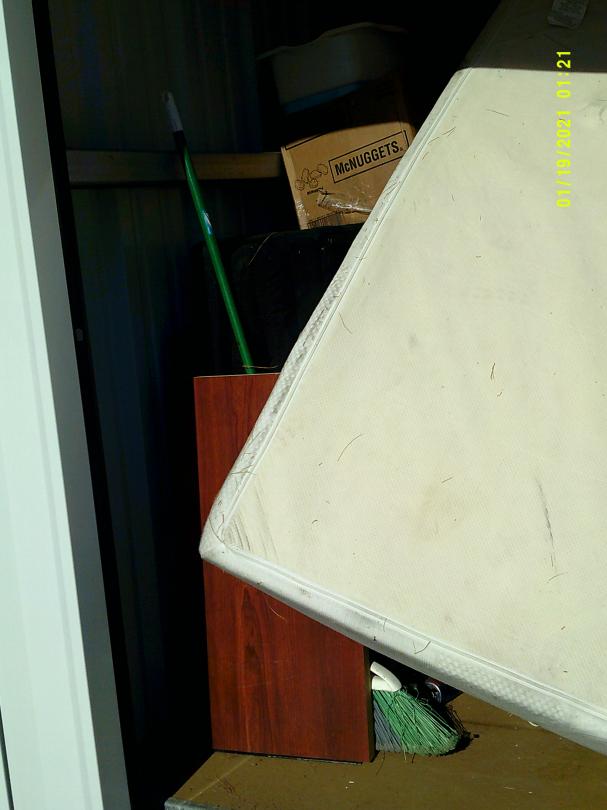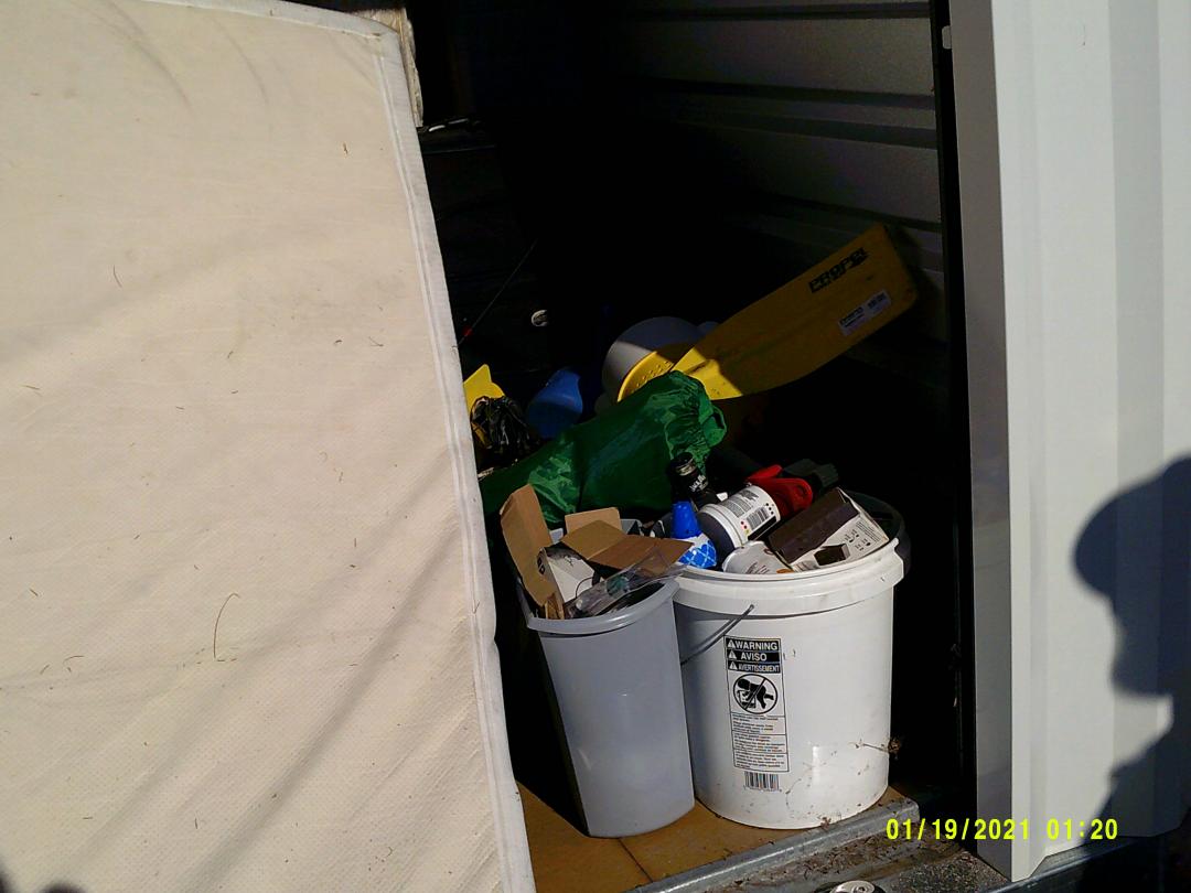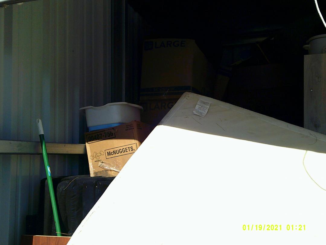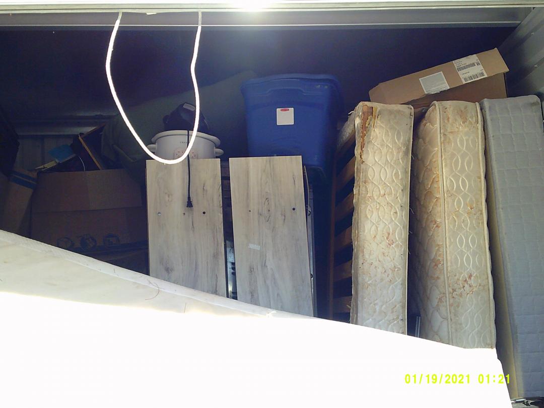 This unit appears to contain…READ ALL AUCTION RULES BEFORE BIDDING!!! Unit appears to contain: mattresses, box spring, shelves, totes, boxes, fishing poles