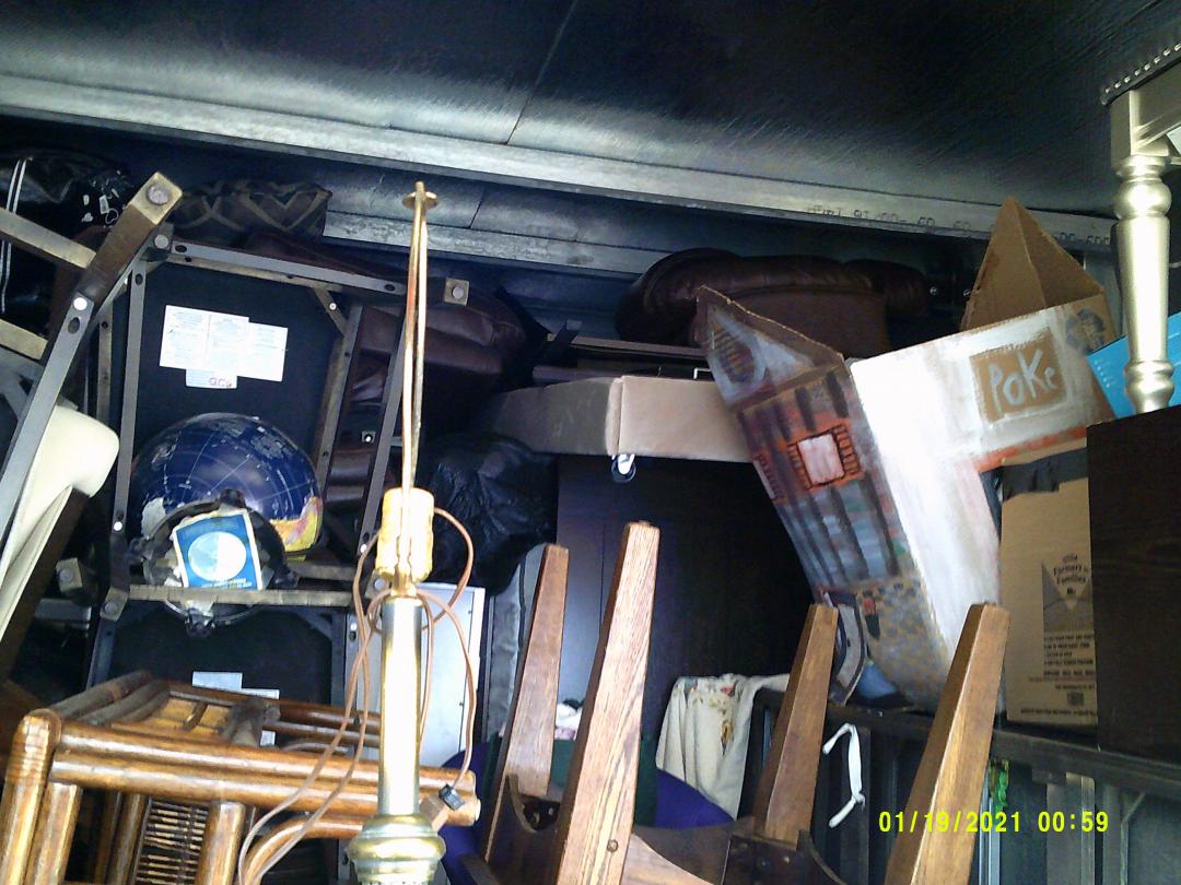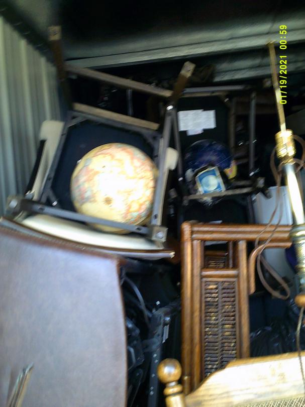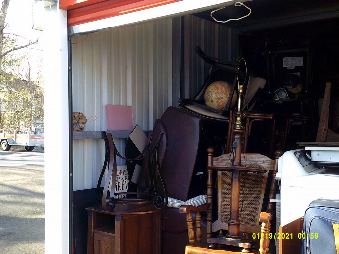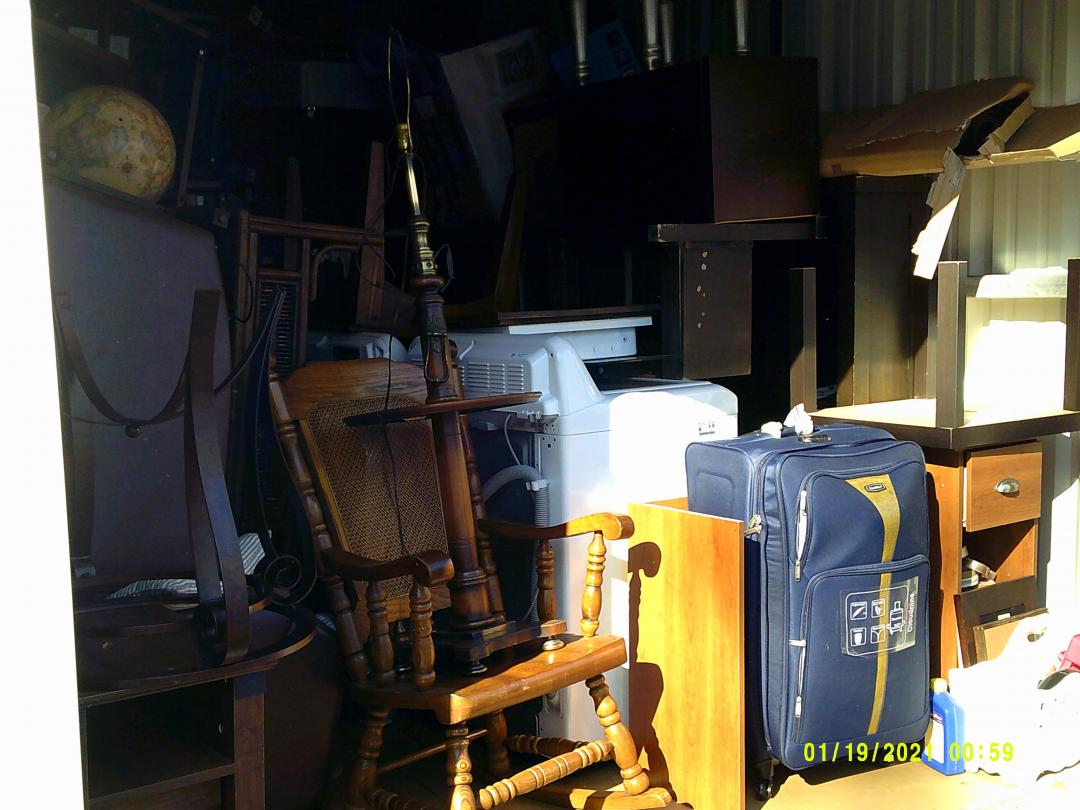 This unit appears to contain…READ ALL AUCTION RULES BEFORE BIDDING!!! Unit appears to contain: Washer, dryer, chairs, suitcases, totes, couch, recliner, globe, rocking chair