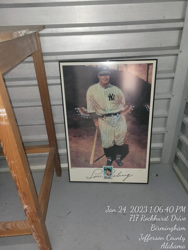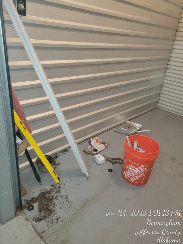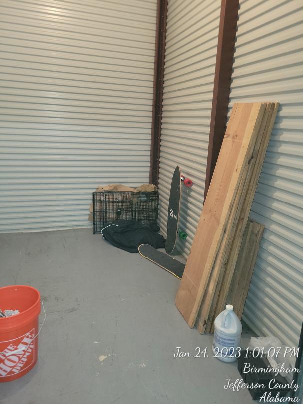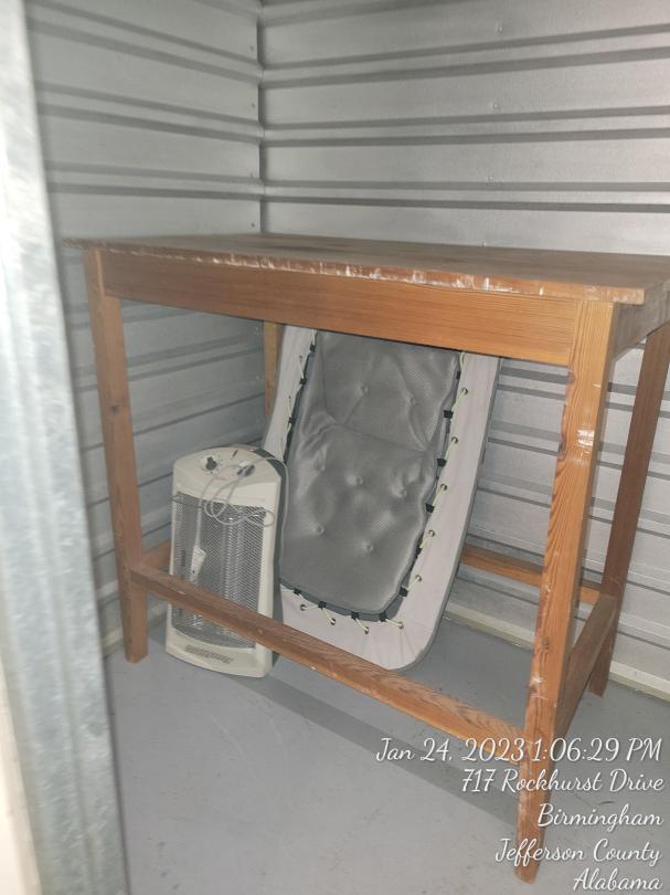 This unit appears to contain…Selling 2 units together. B-486 & B-414. Work table, baseball picture, heater, skate boards, bucket, dog cage. MISC