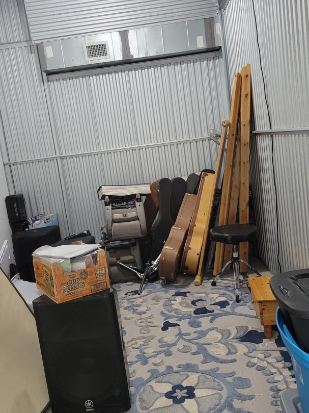 This unit appears to contain…tubs, tri-pod, mattress, rug, drums, speakers, car seats, headboard, guitar cases, misc.