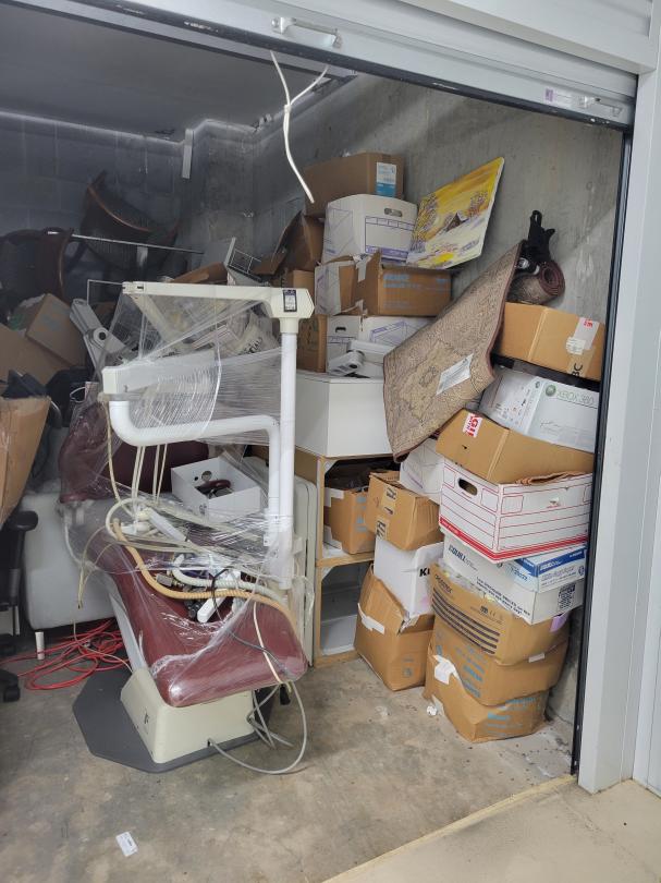 This unit appears to contain…Boxes, dentist chair, rug, folding table, chairs, wall art, office chairs All personal files, medical files, etc if any will need to be returned to the office.