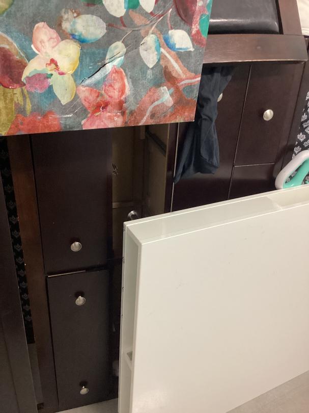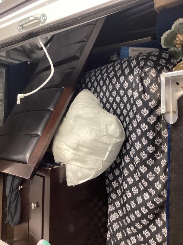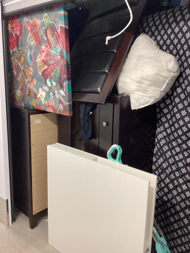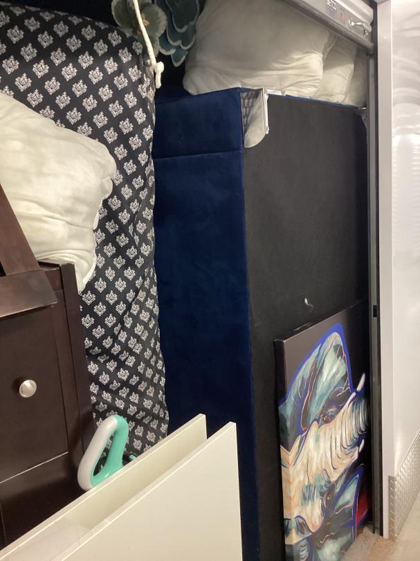 This unit appears to contain…Dresser, Bed Frame, pillows, pictures, mattress, decorations