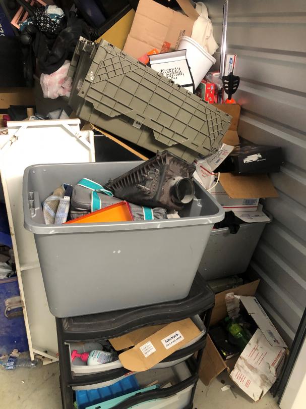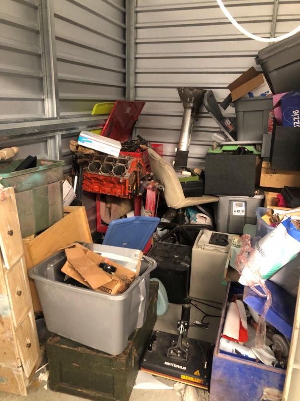 This unit appears to contain…This unit seems to contain :1 Dining table ,tool box,4 chairs,several totes,clothes car parts misc items....