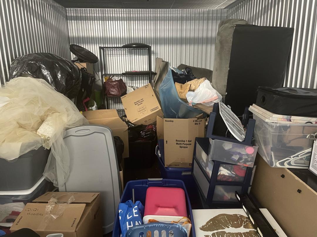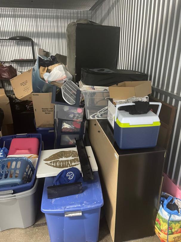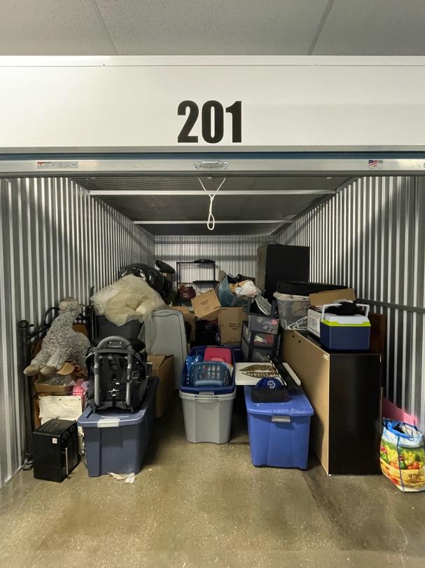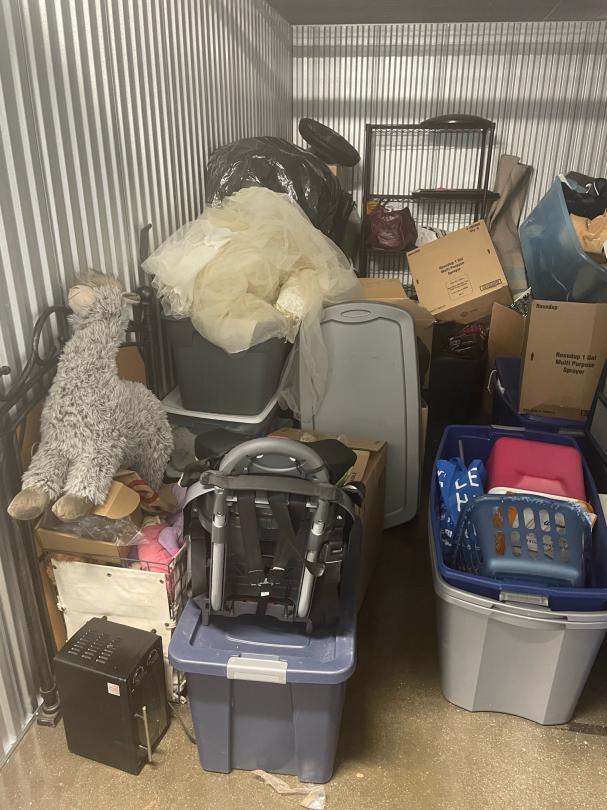 This unit appears to contain…Household items, dresser, totes, bed frame, car seat