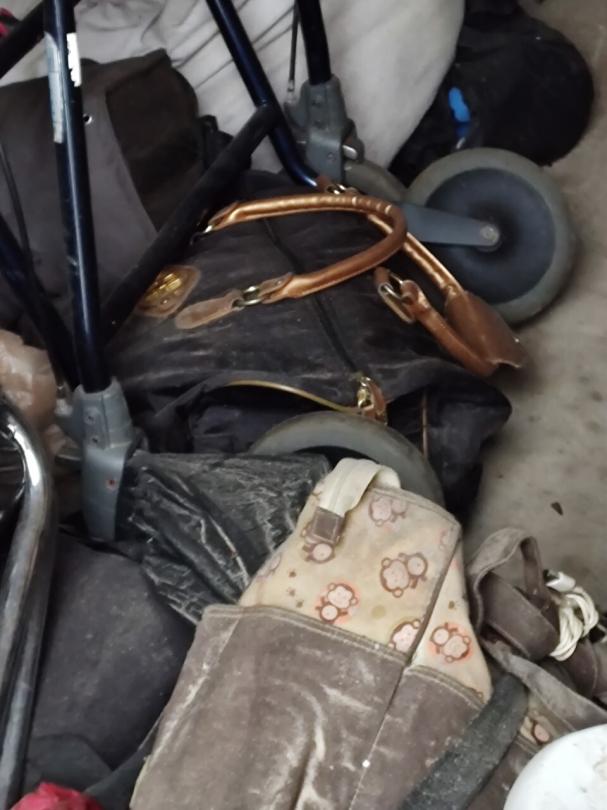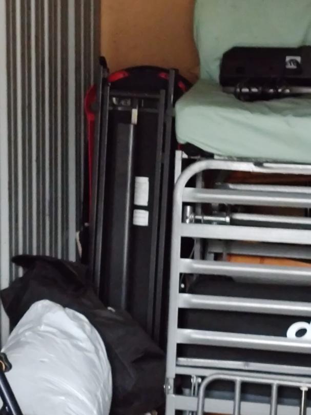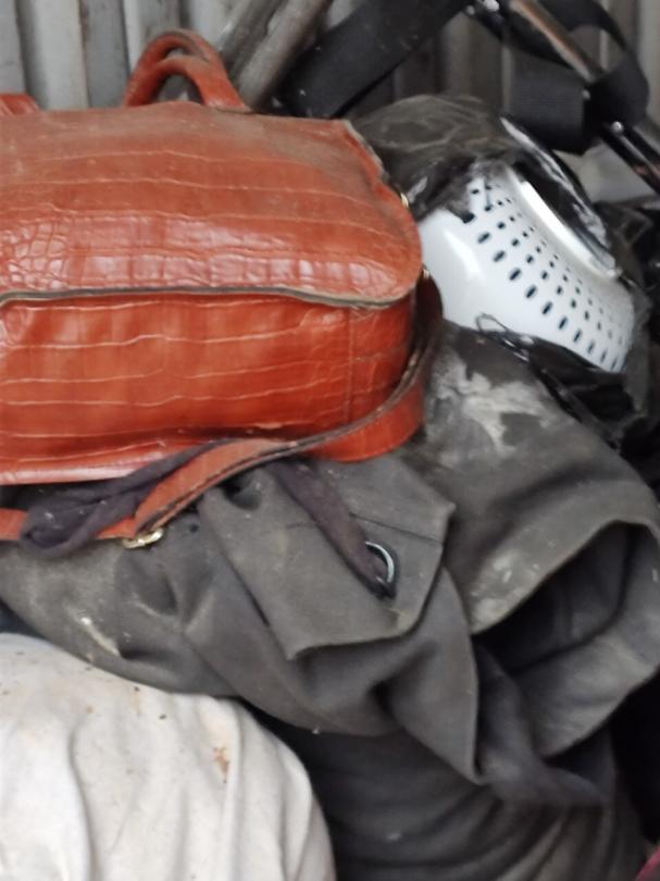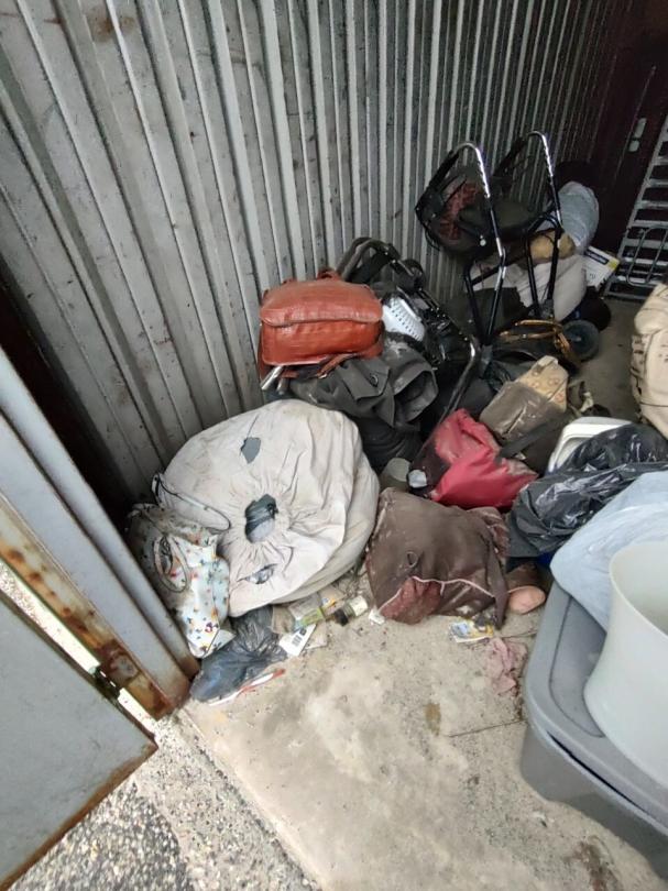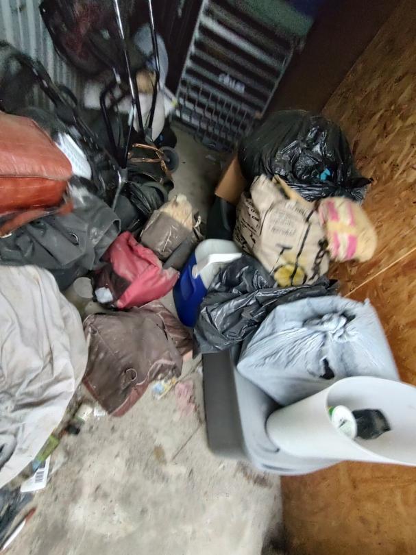 This unit appears to contain…This unit appears to contain totes, bags, purses, cooler, handicap walker, mattress, bed frame, boxes and miscellaneous items.