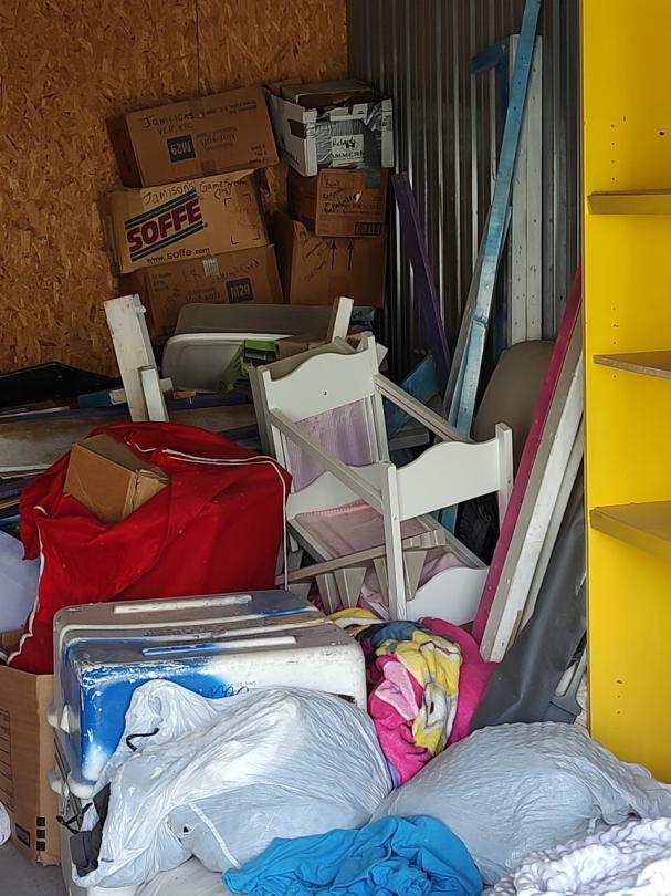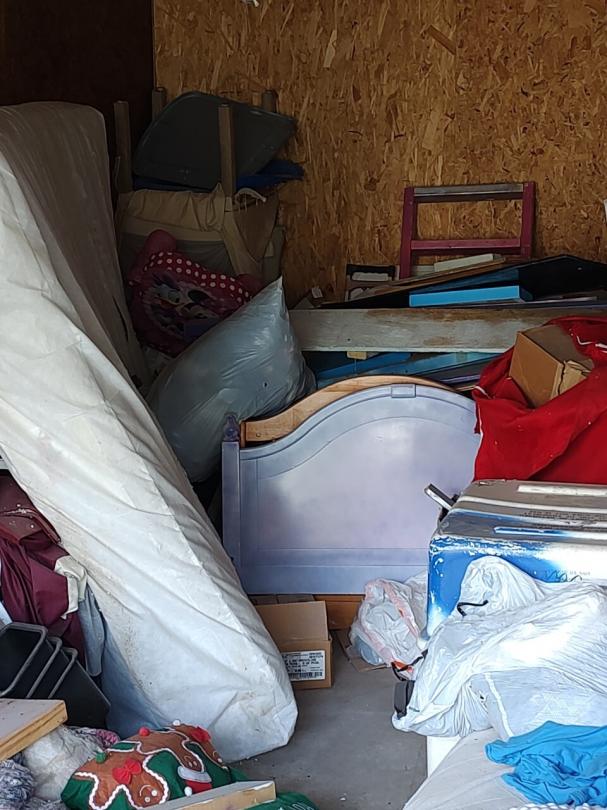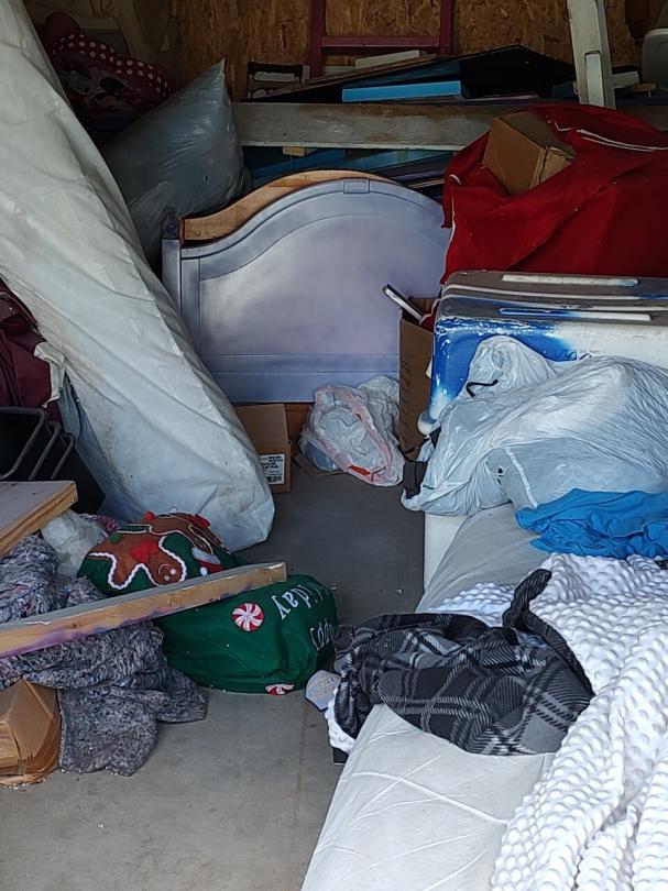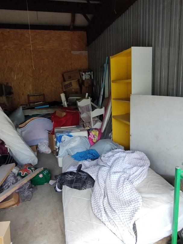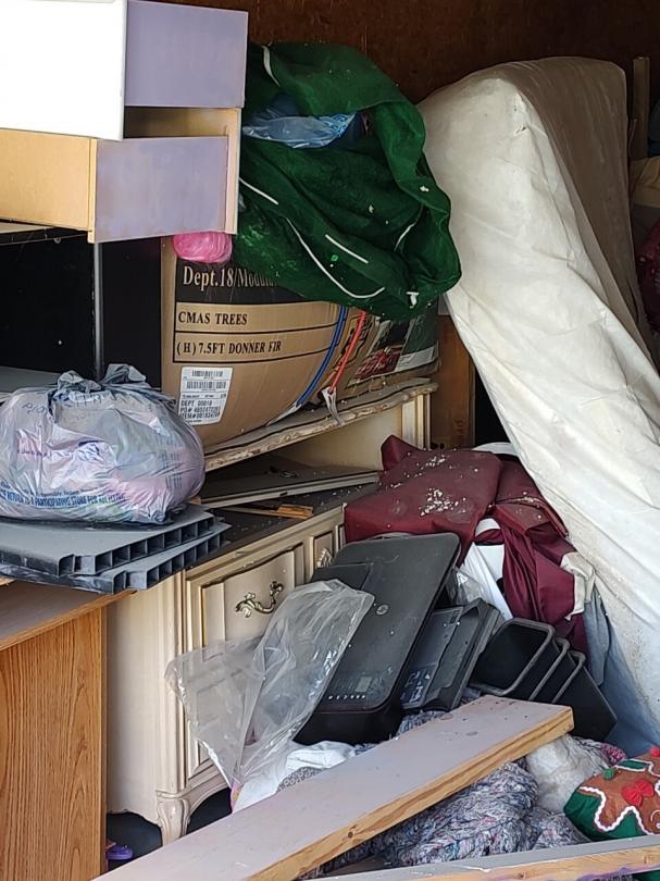 This unit appears to contain…This unit appears to contain mattresses, bed frame, box springs, dresser, bags, boxes, bookshelves, miscellaneous furniture, headboard, footboard.