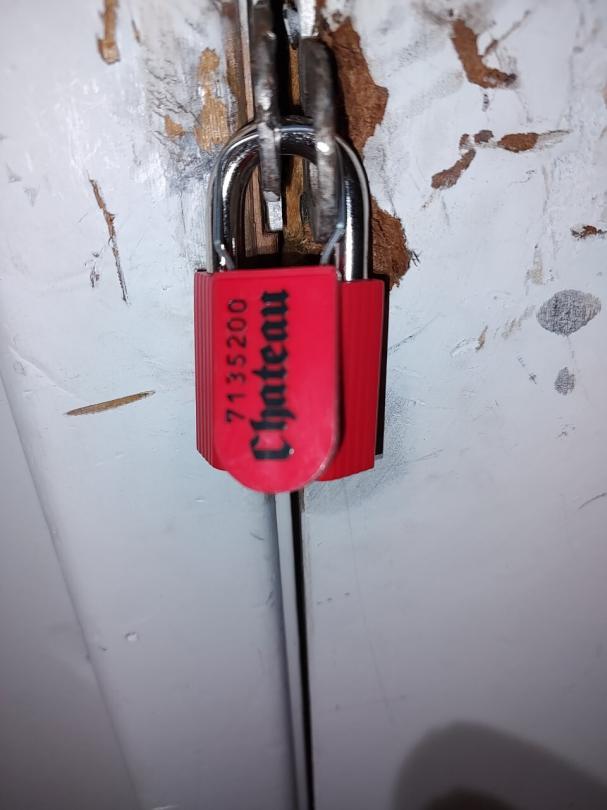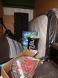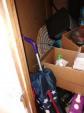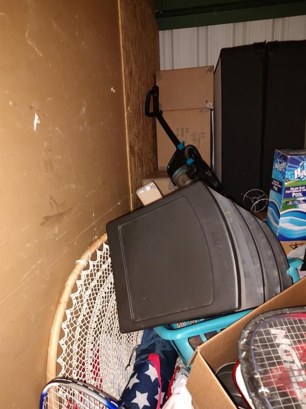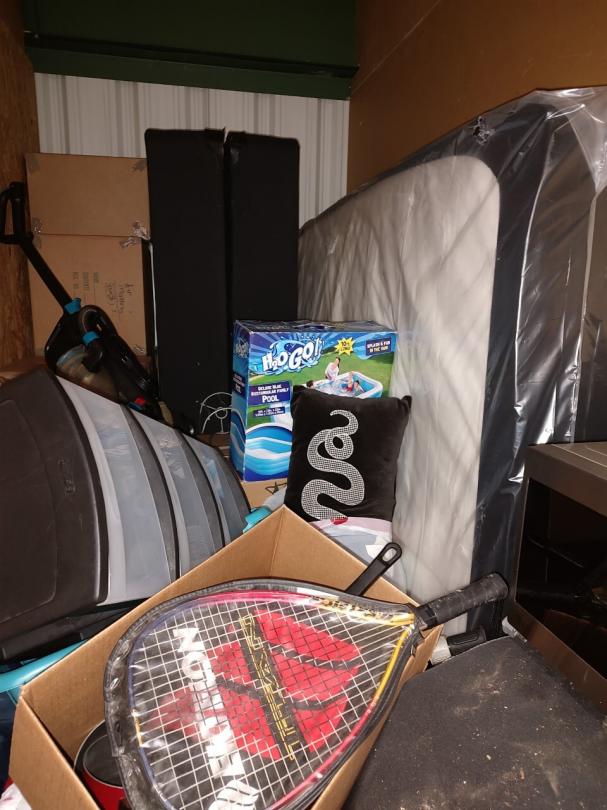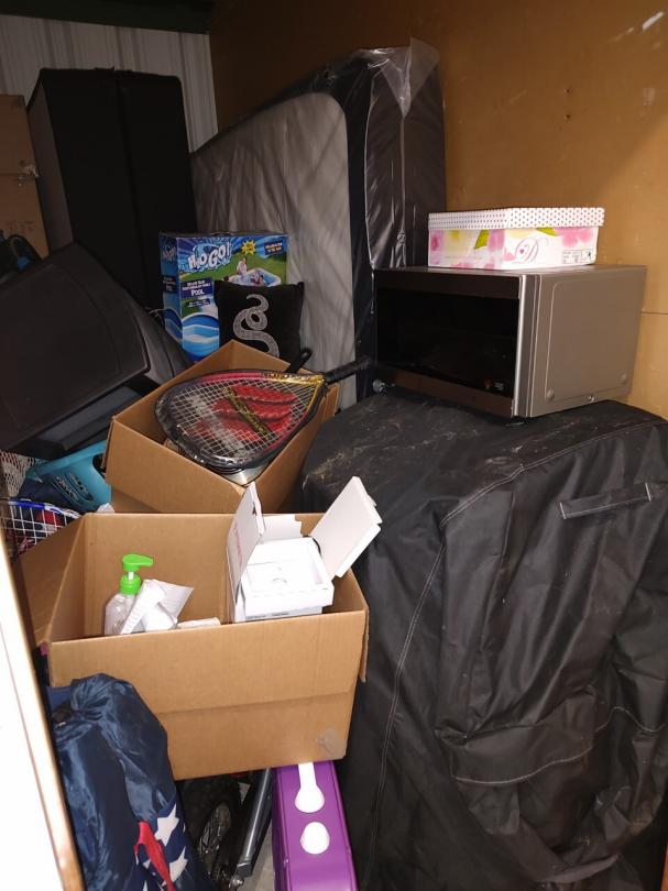This unit appears to contain…This unit appears to contain a microwave, mattress, box spring, totes, boxes, sports gear, cleaning supplies, fan, plastic organizer, lawnchairs.