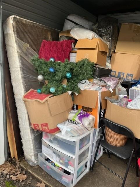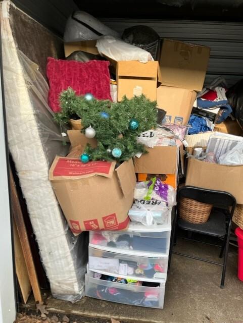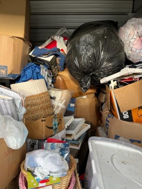 This unit appears to contain…Box Springs, Chairs, Decor, Plastic Bags, Plastic Containers, Misc Boxes, Clothing, Misc Items