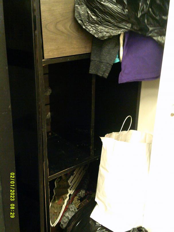 This unit appears to contain…READ ALL AUCTION RULES BEFORE BIDDING!!! Unit appears to contain: Fish Tank, wall decor, kitchen items, lamp, clothing, shelf unit, fish tank stand, bags, boxes, totes
