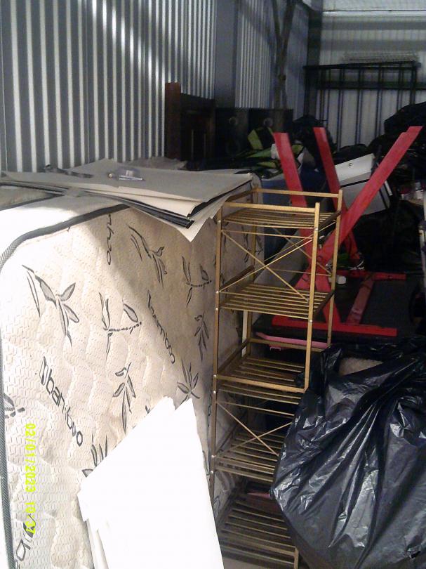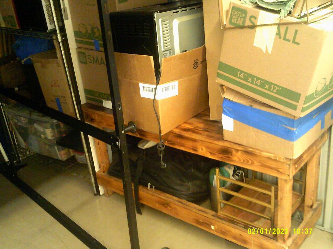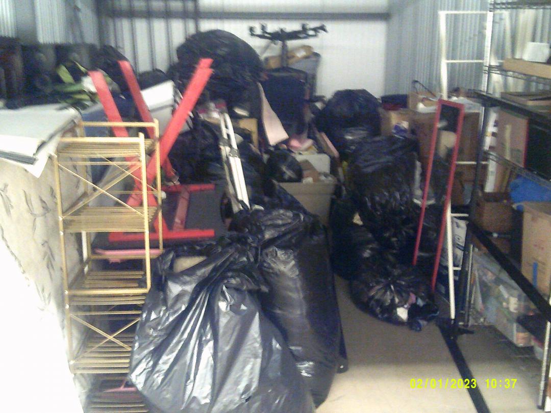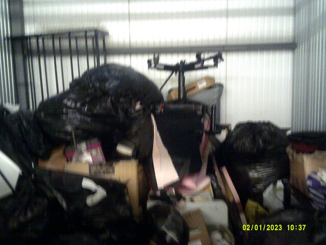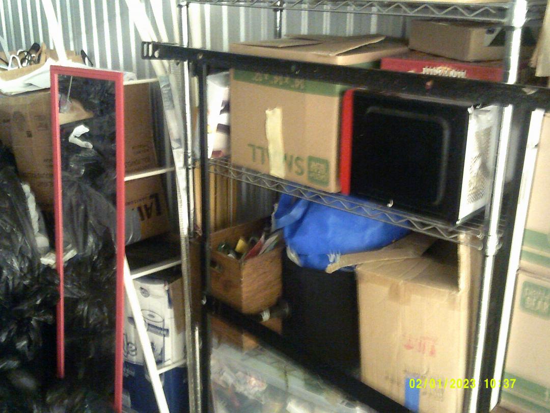 This unit appears to contain…READ ALL AUCTION RULES BEFORE BIDDING!!! Unit appears to contain: Coffee table, boxes, bags, totes, shelf unit, gaming desk, mattress/box spring, microwaves