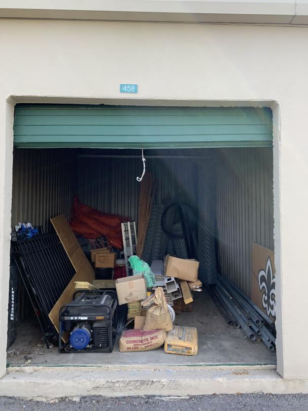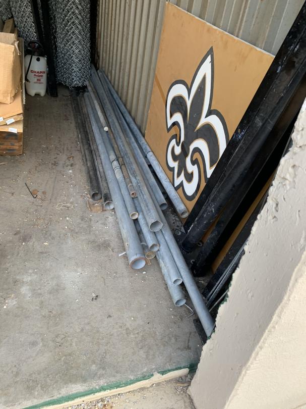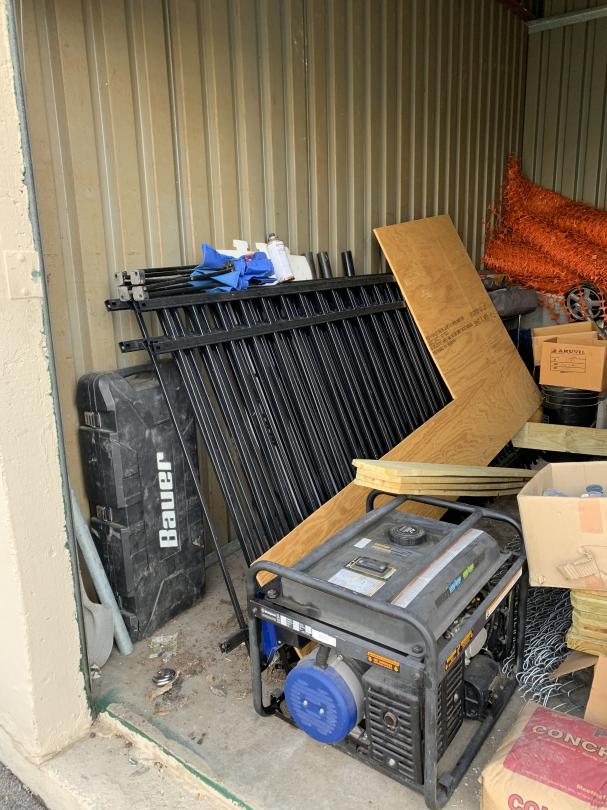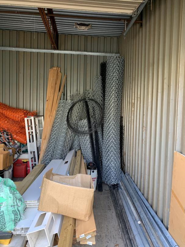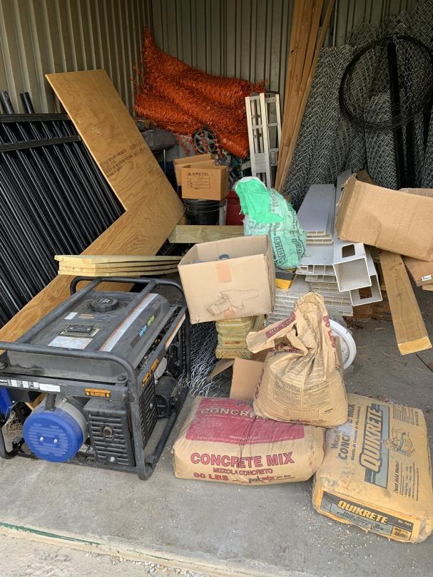 This unit appears to contain…fences, generator, wood, metal poles, concrete mix, Saints picture