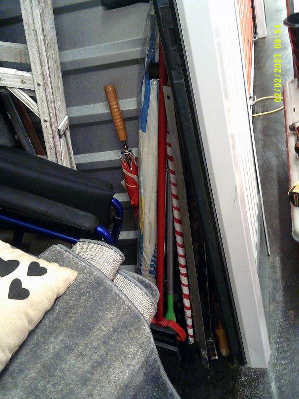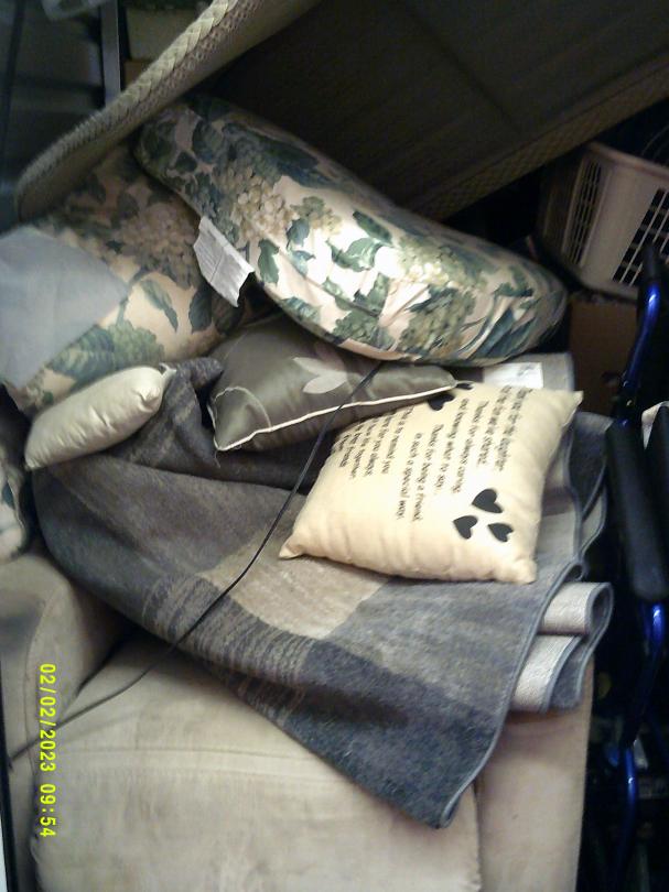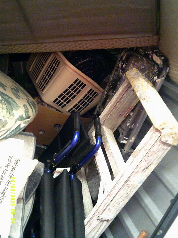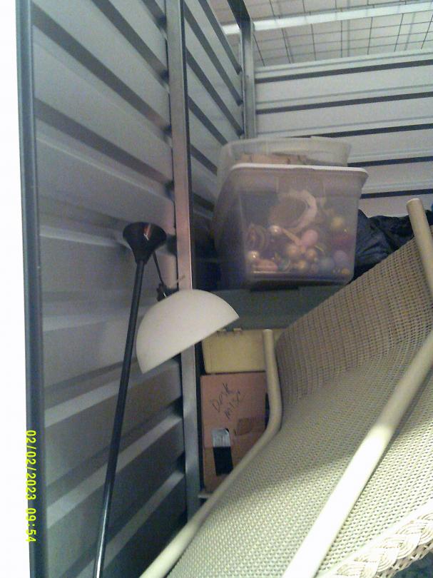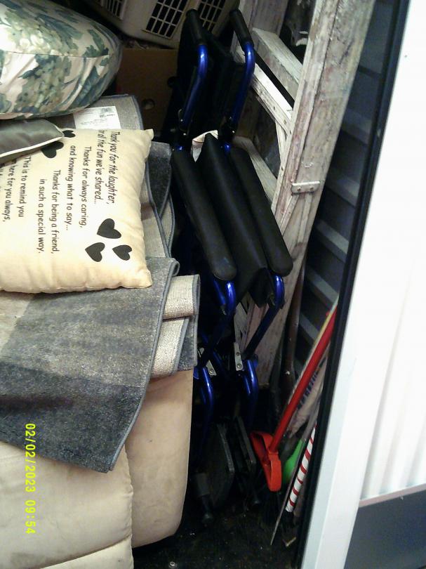 This unit appears to contain…READ ALL AUCTION RULES BEFORE BIDDING!!! Unit appears to contain: Chair, wheelchair, patio chair, lamp. ladder, totes, bags, boxes, art/decor, xmas decor