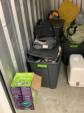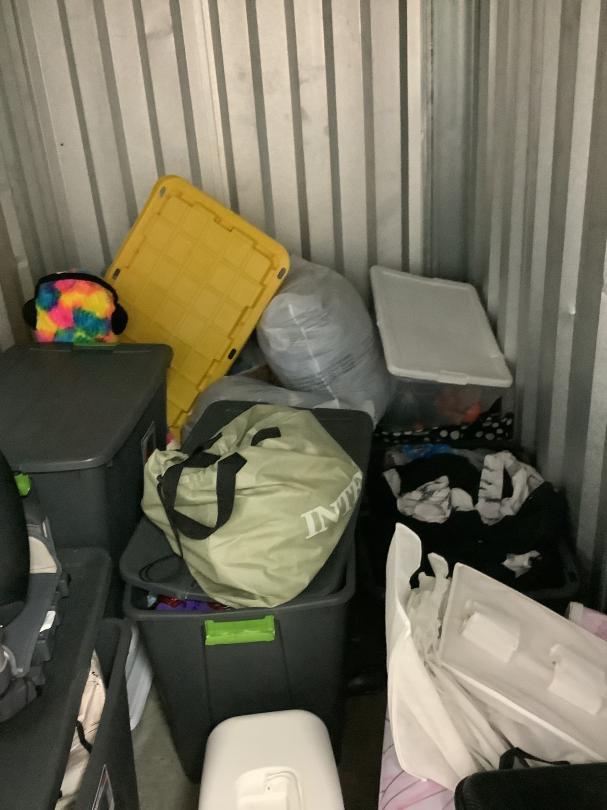This unit appears to contain…Plastic totes, bags, luggage, sewing machine, toddler seats, boxes