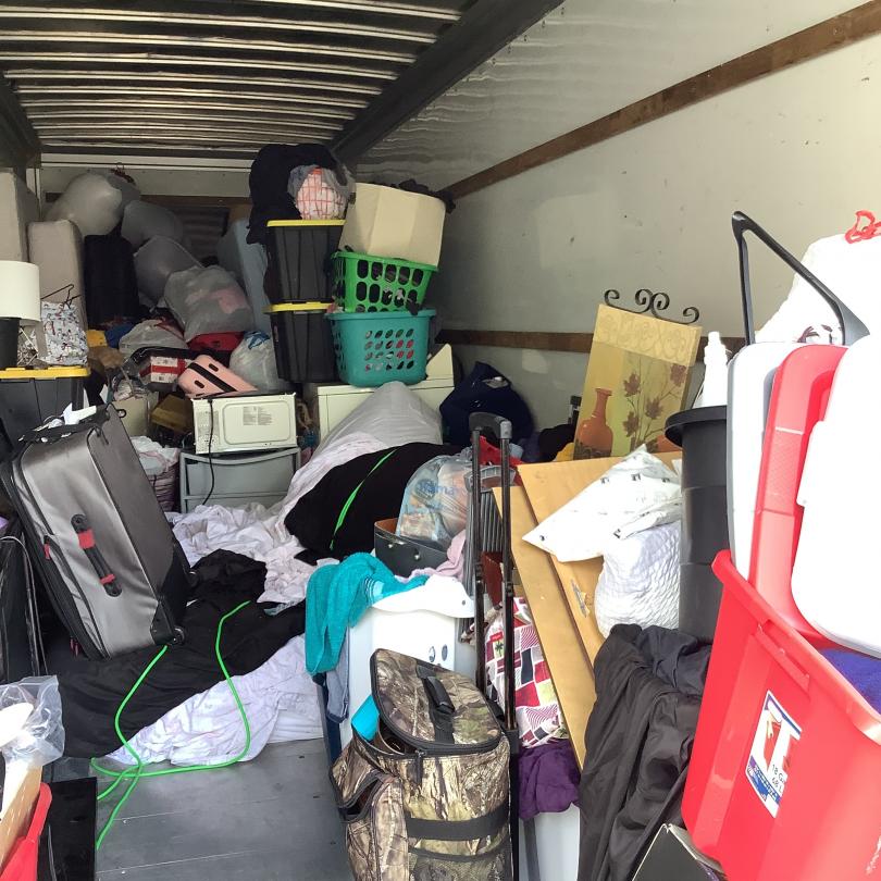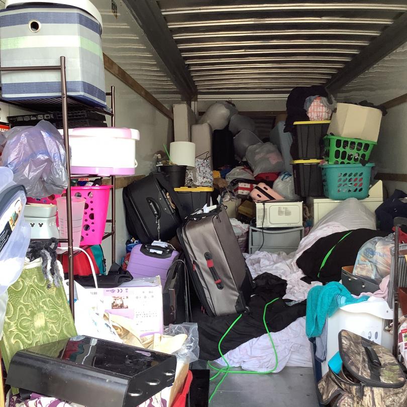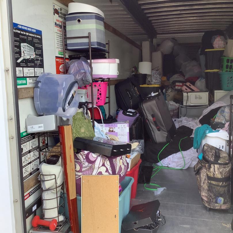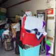 This unit appears to contain…Plastic totes, blankets, mirrors, luggage, boxes, bags, cleaning supplies, baskets, microwave, washer, lamp, mattress, clothes, rugs, wall art