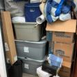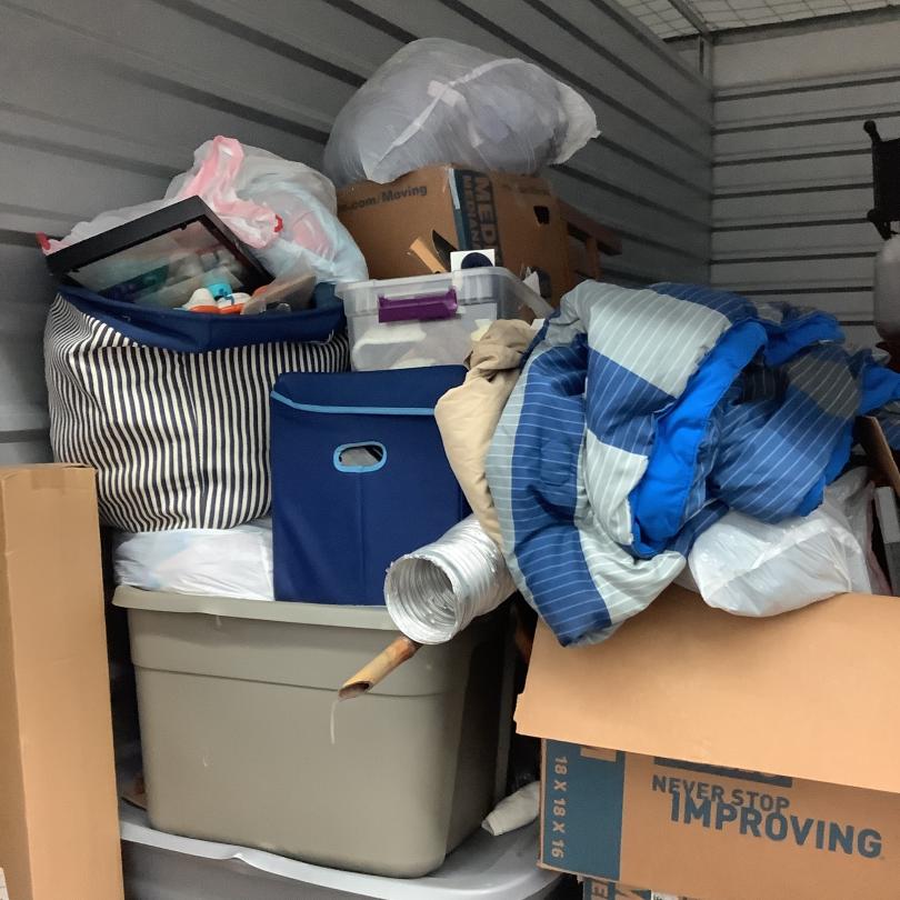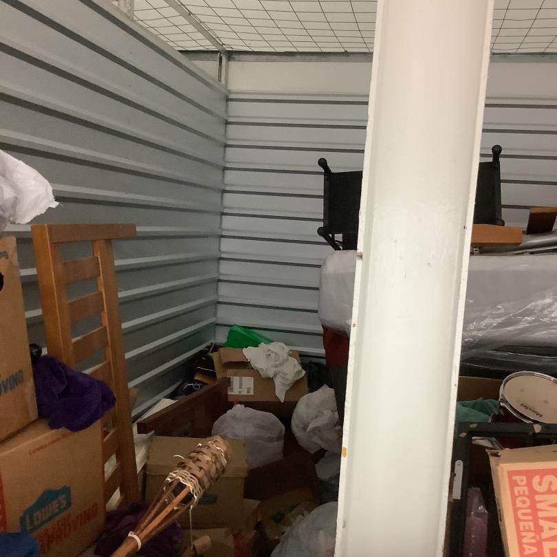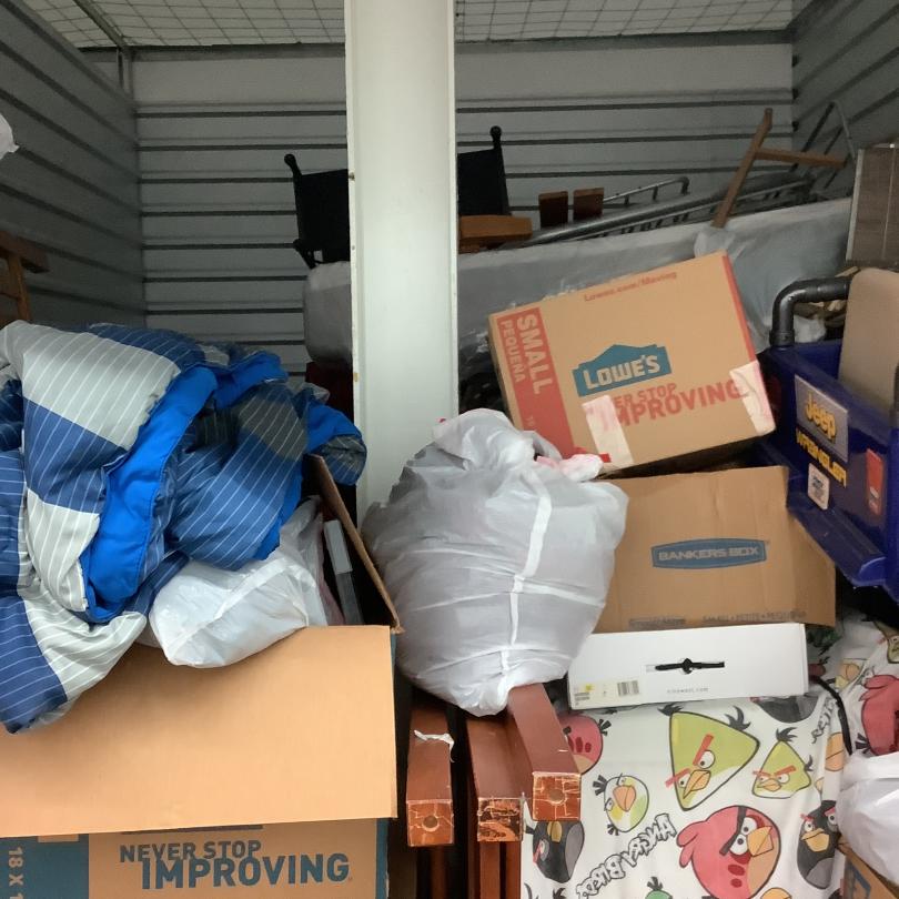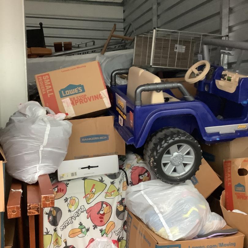 This unit appears to contain…Bed frame, boxes, bags, mattress, toy car, metal racks, plastic totes, blankets, tiki torch