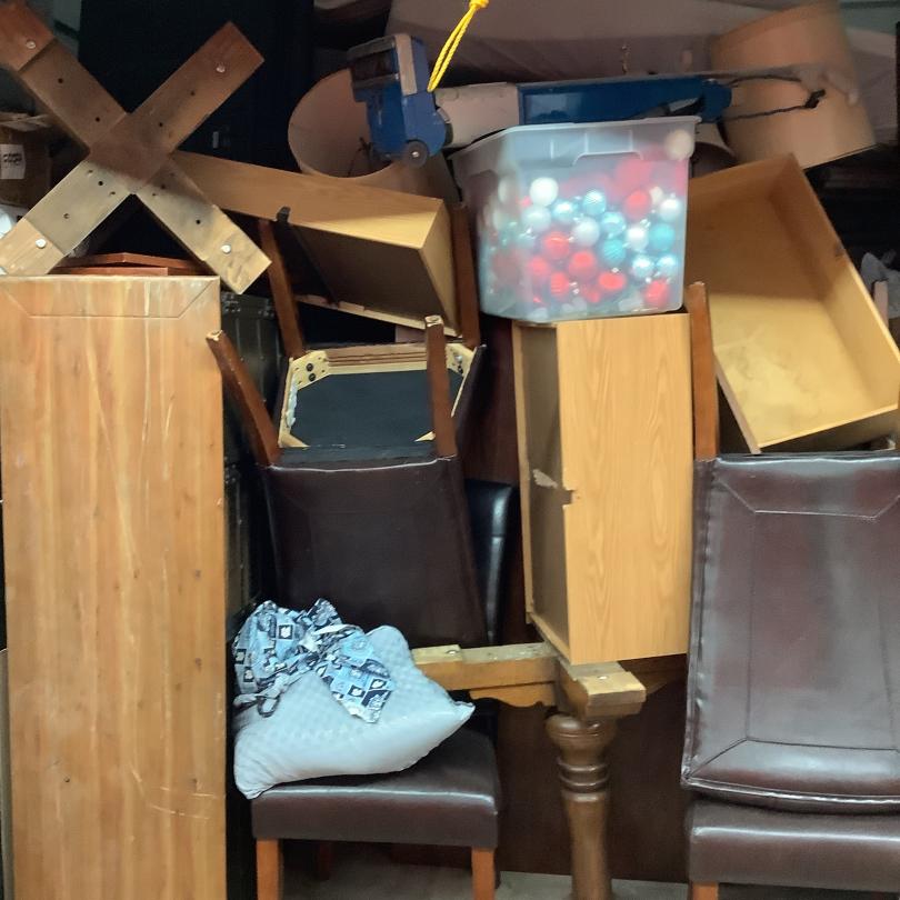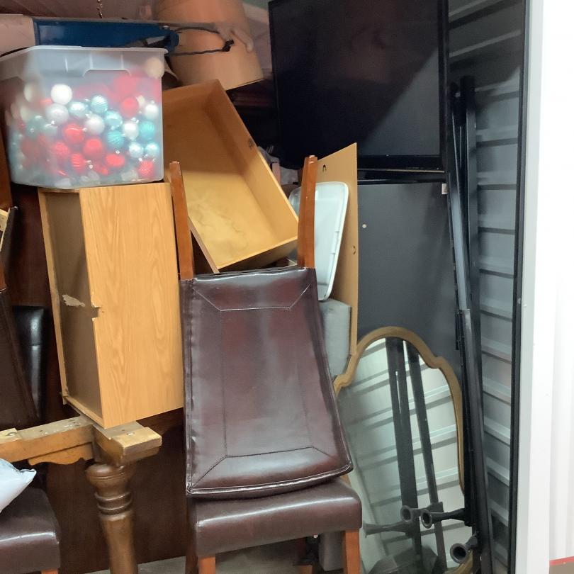 This unit appears to contain…Tv, lamps, mirror, chairs, Christmas decor, tables, cabinets, dresser, microwave
