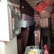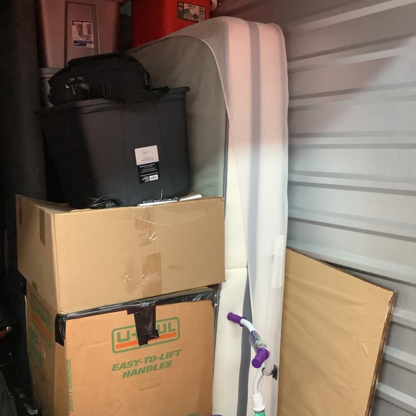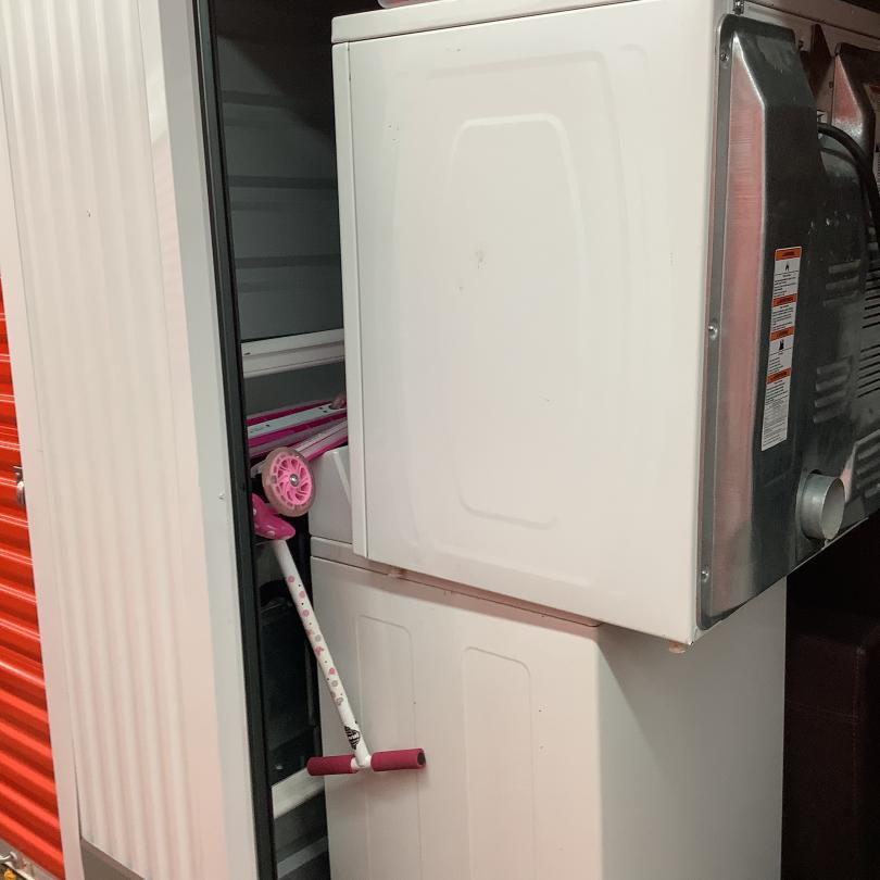 This unit appears to contain…Washer, dryer, scooter, mattress, box spring, plastic totes, couch, chair, wall art, kid bike