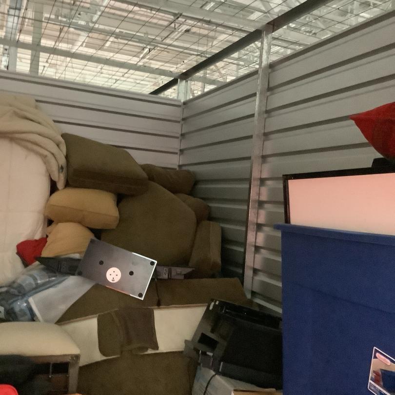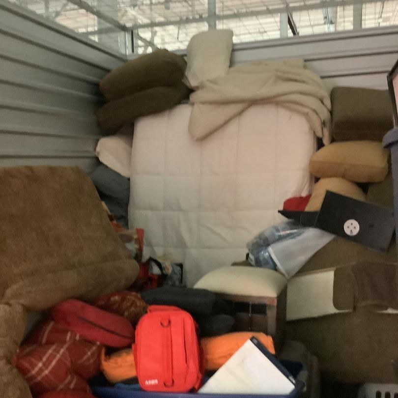 This unit appears to contain…Couch, plastic totes, mattress, stools, dresser, side table, recliner, headboard