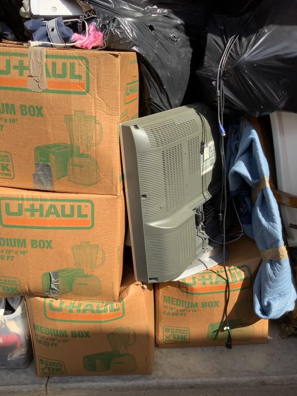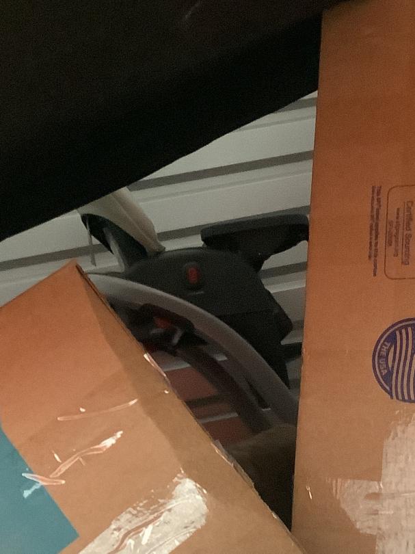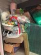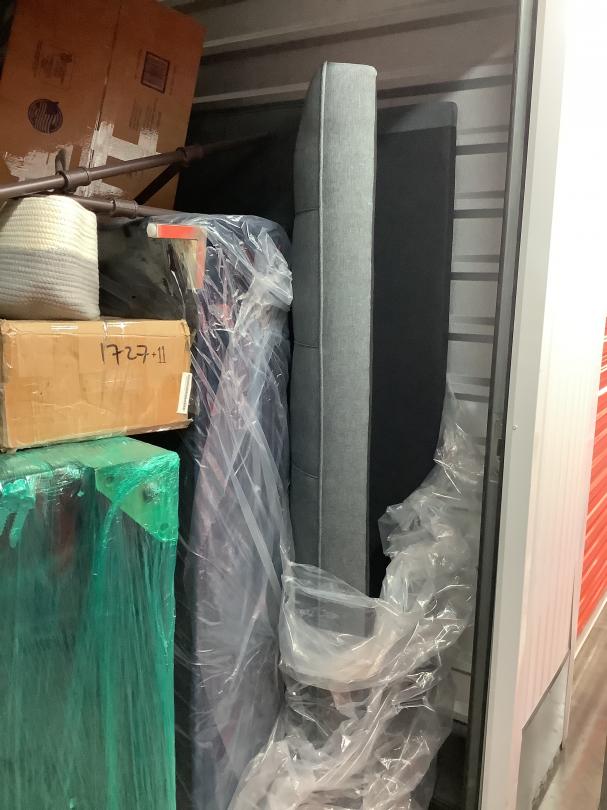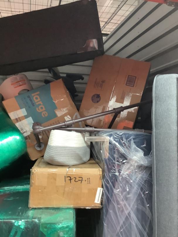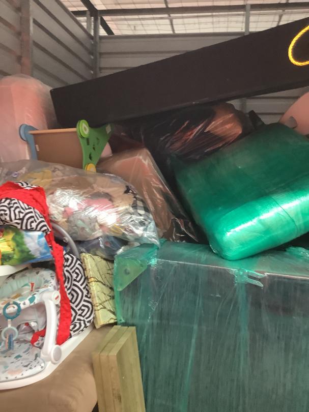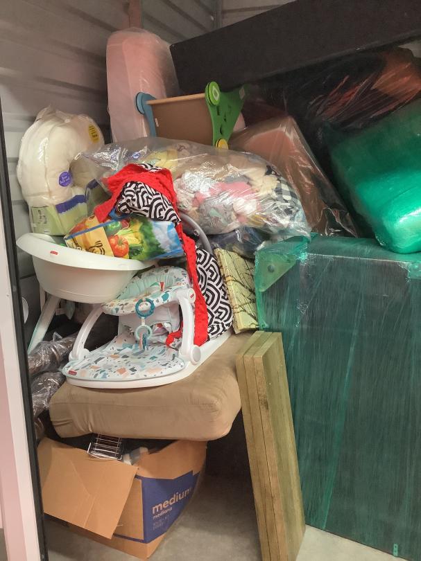This unit appears to contain…Car seat, pipes, shelving, boxes, ottoman, futon, toys, bags, baby items