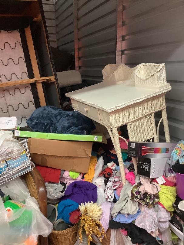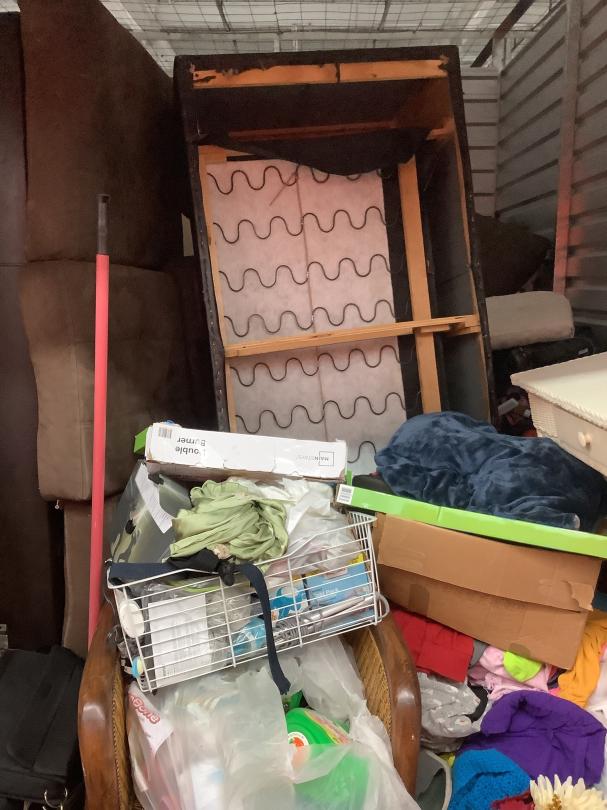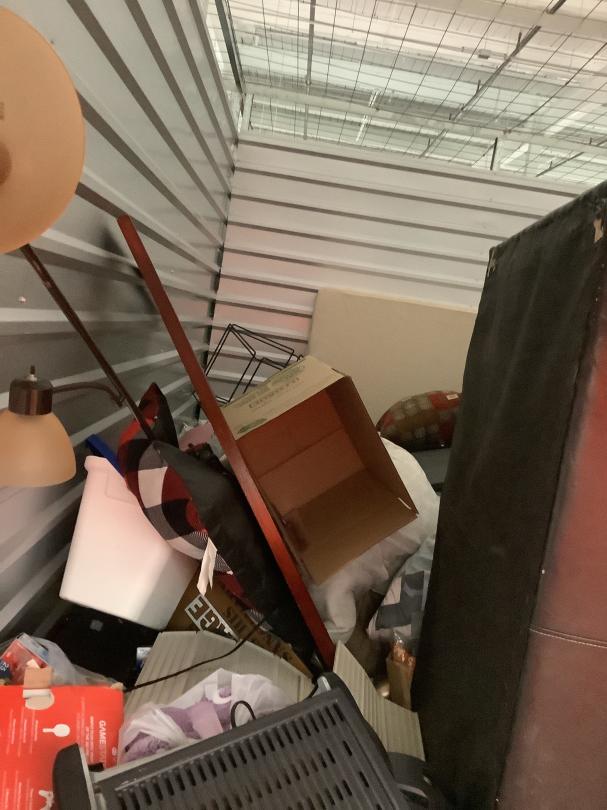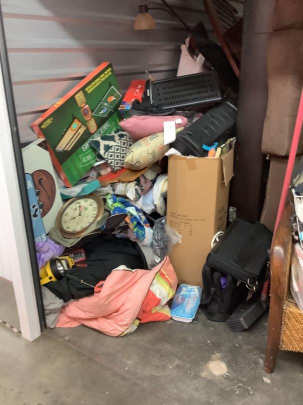 This unit appears to contain…Couch, bags, boxes, luggage, clothes, clock, games, lamp, blanket, side table