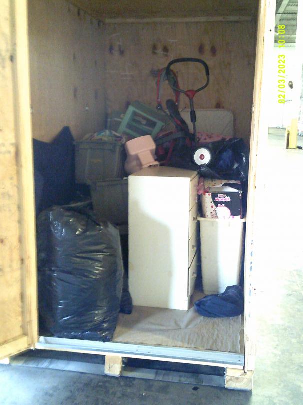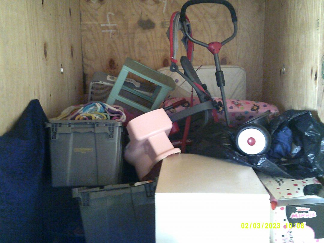 This unit appears to contain…READ ALL AUCTION RULES BEFORE BIDDING!!! Unit appears to contain: Dresser, toys, bags, crib mattress, fan, totes