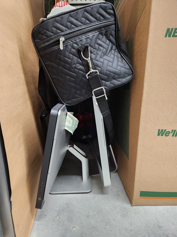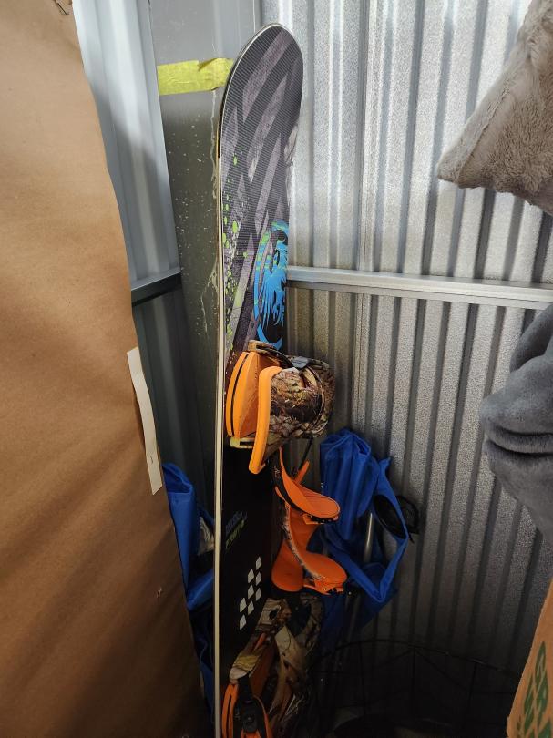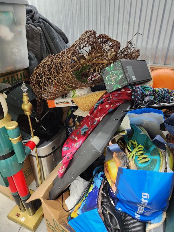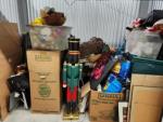 This unit appears to contain…BINS/BOXES/PICTURES/HOLIDAY DECORATIONS/PC MONITORS/SNOWBOARD/TV