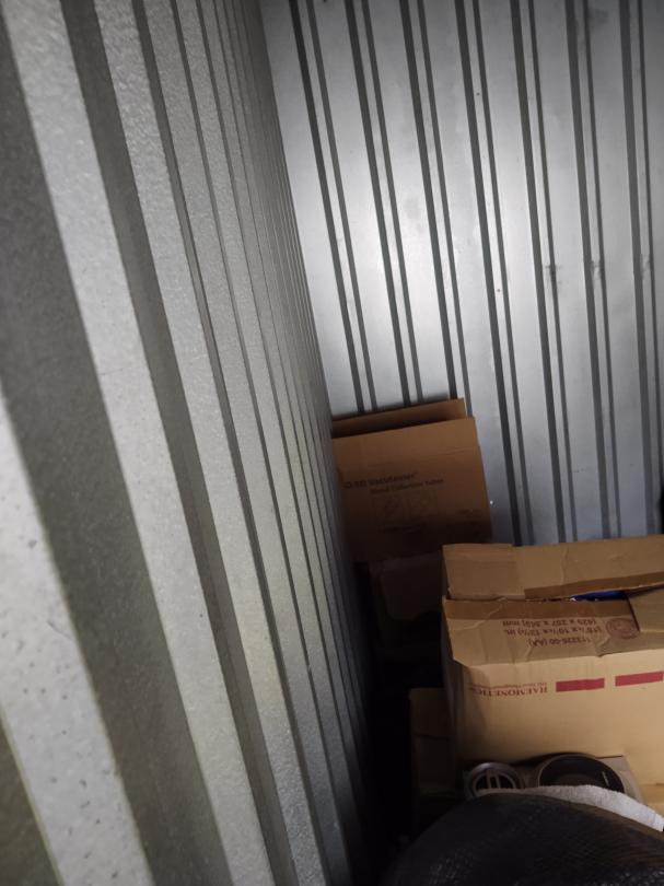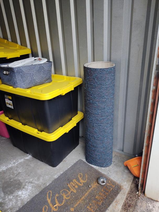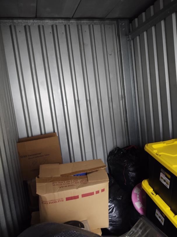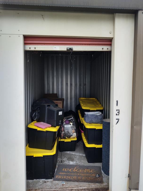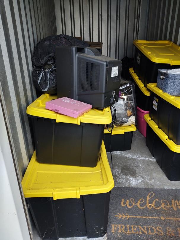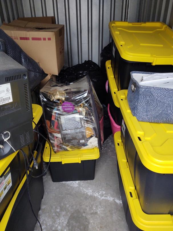This unit appears to contain… Several Plastic Totes, Carpet , Tv, Dvd player, stero system, end table, storage basket, clothes, Boxes and misc items