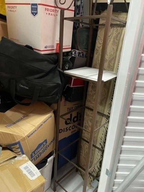 This unit appears to contain…5X10X8CC: Totes, boxes, bakers rack, clothes, gym bag, baskets, household goods, rug