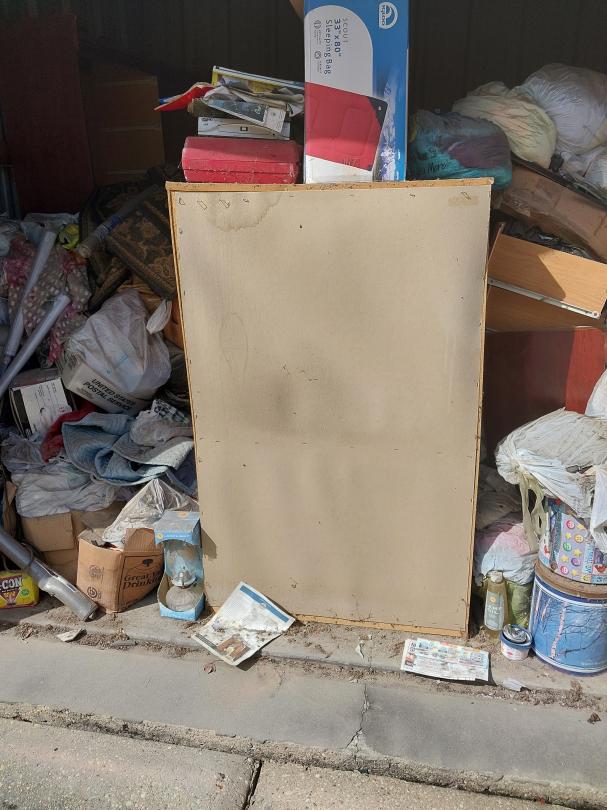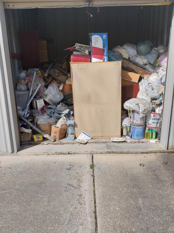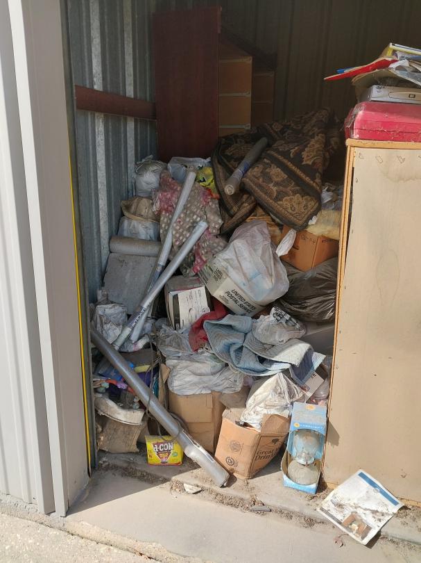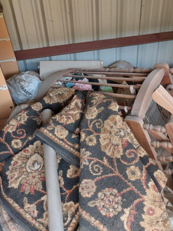 This unit appears to contain…10X10X8 Bags, Boxes, Chairs, Dresser, Office Chair, Household Goods, Rug, Lamp, DVD Player