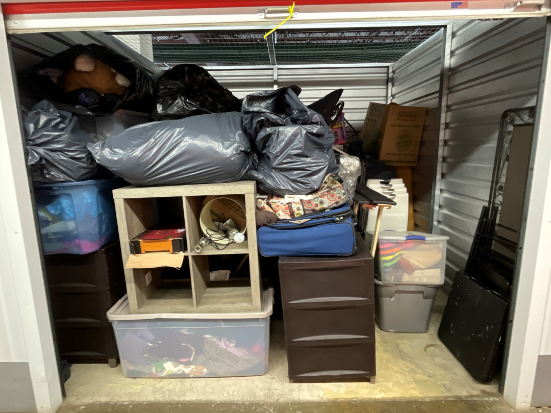 This unit appears to contain…Lamps, Shelving unit, toys, bags, totes, chairs, suitcases, bedframe