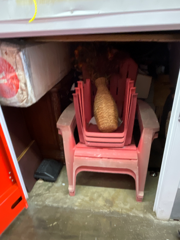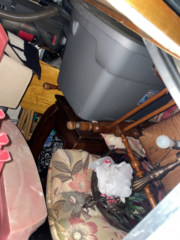 This unit appears to contain…outdoor chairs and tables, Christmas tree, vacuum, decorations, lamps, folding tables