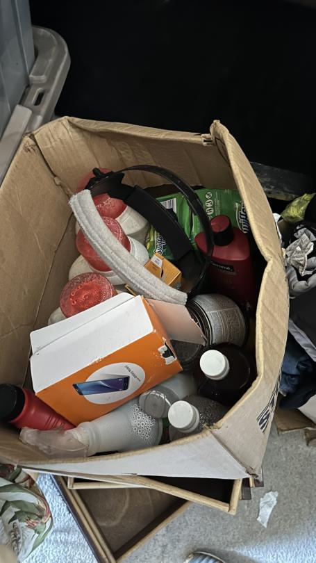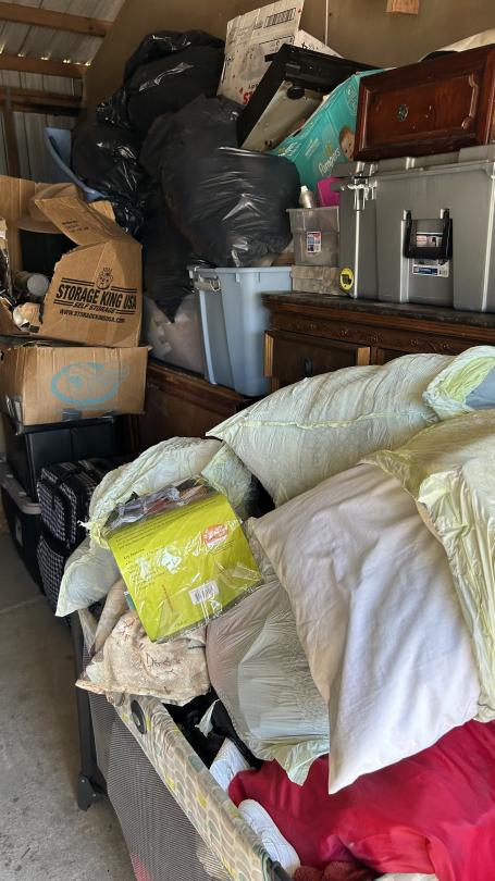 This unit appears to contain…Night Stand, Totes, Entertainment cabinet, suitcases,