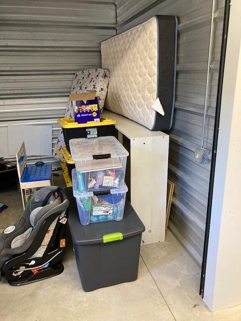 This unit appears to contain…Child bed and mattress, child seats, totes