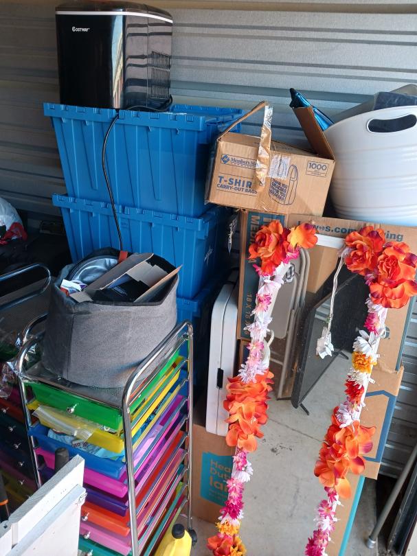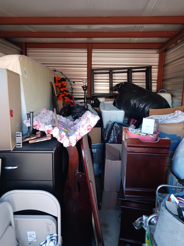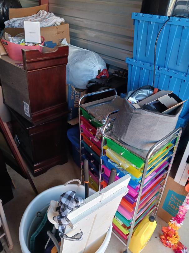 This unit appears to contain…T.V., 3 dressers, T.V. stand, 3 night stands, 2 sets of mattresses and box springs, 2 bed frames, ice machine, art supplies, deep fryer, shoes, weed eater, purses, lamp, bedding, totes, boxes, books, decorations