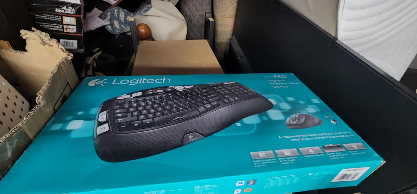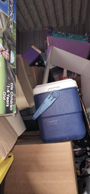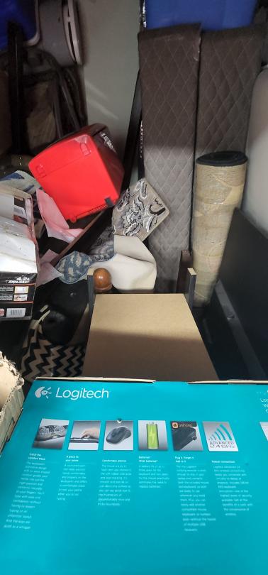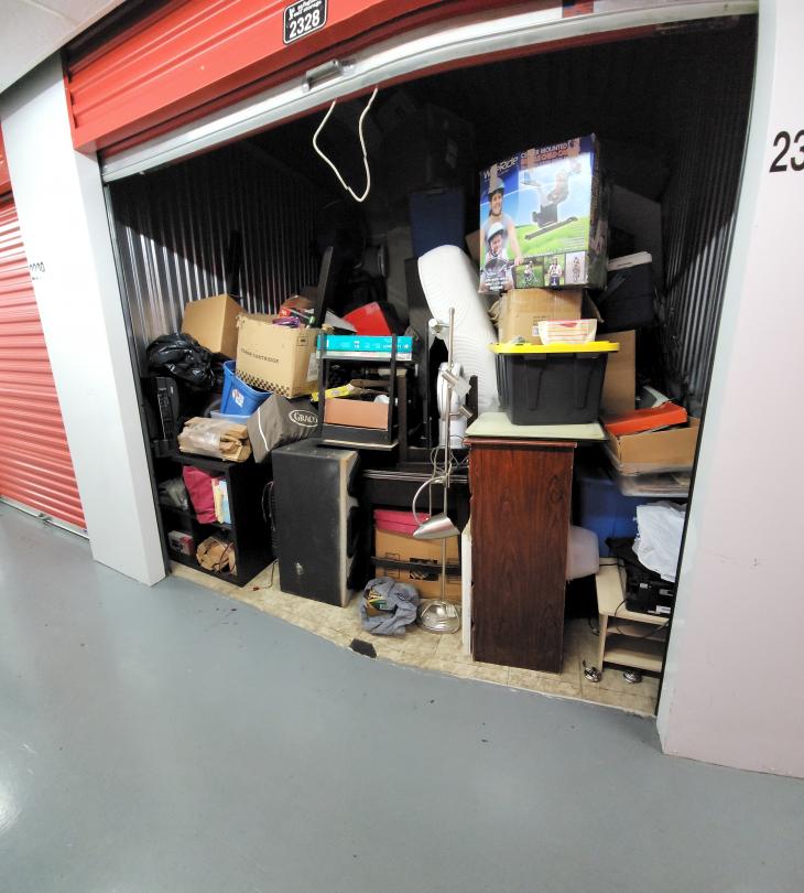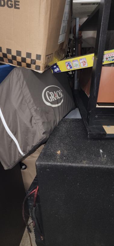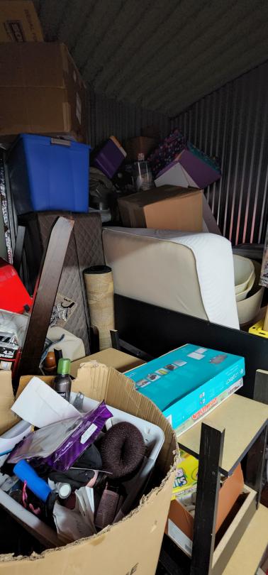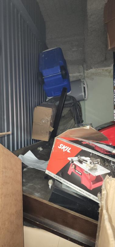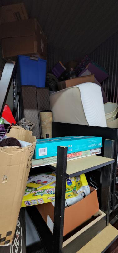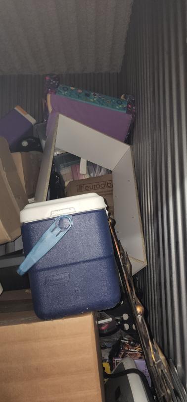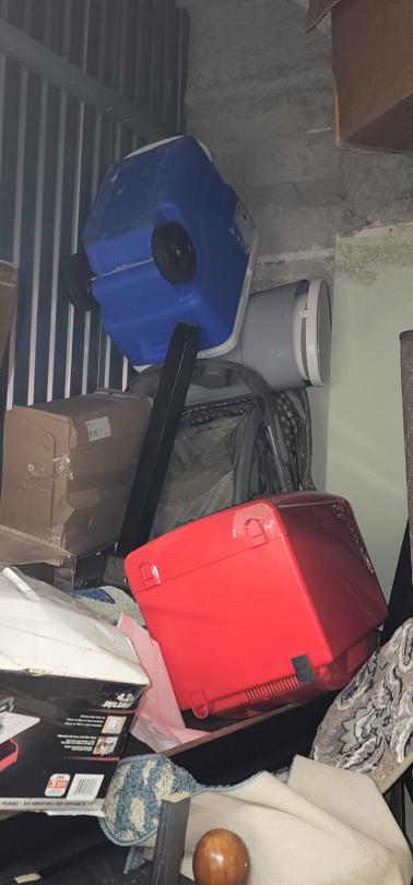 This unit appears to contain…Epson-copier, vacuum, rugs, Logitech-wireless keyboard & mouse, ice chest, speaker, Graco-Pac N Play, sectional, stroller, bookshelf, bed frame, box spring, wall art, skill saw, kitchen table.