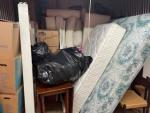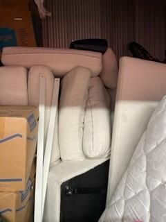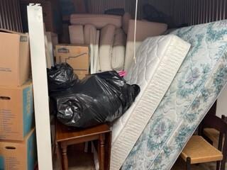 This unit appears to contain…bike, bags, boxes, chairs, clothes, folding dining table, headboards/footboards, bed frames, twin mattresses, queen mattress, book shelves,sofa, bedding