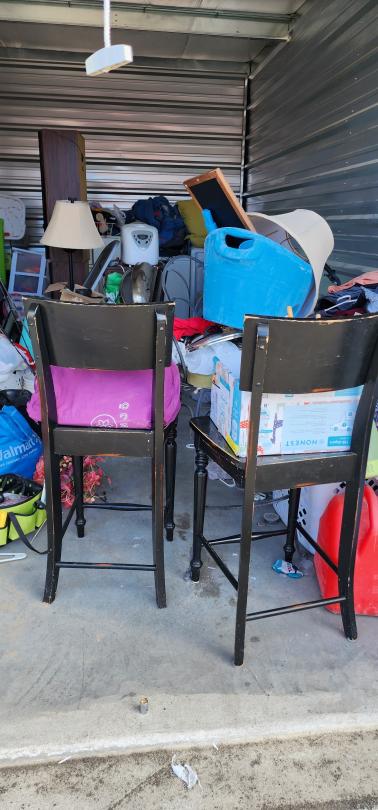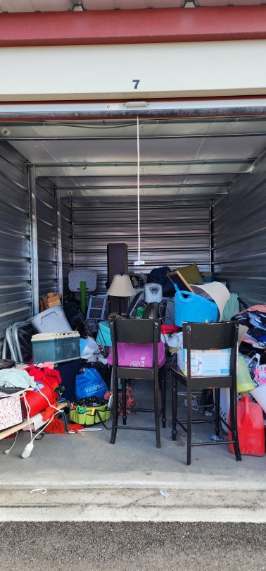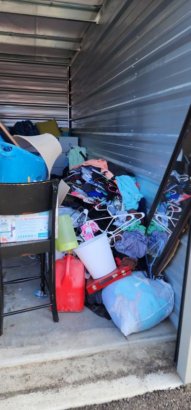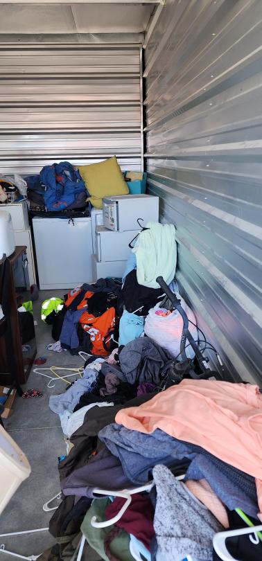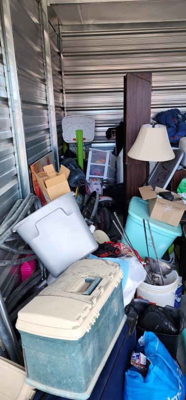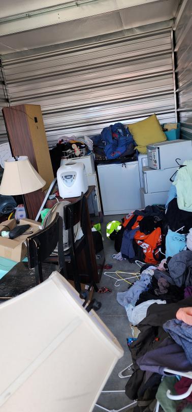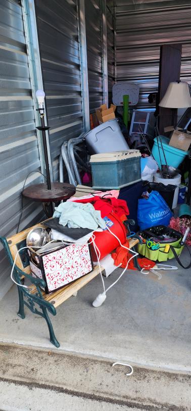 This unit appears to contain…Chairs, Mirror, Washer/dryer , BMX Bike, Tower speakers, Fishing tackle box, cloths, pots, Ice, Lamp, Kids Bench seat. end table, boxes