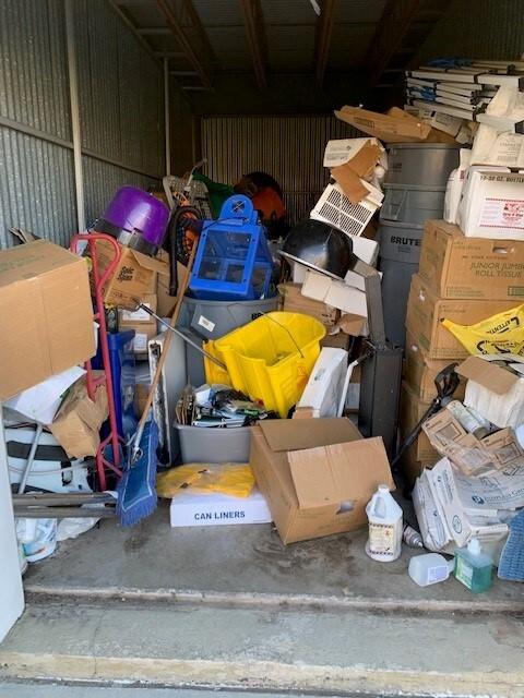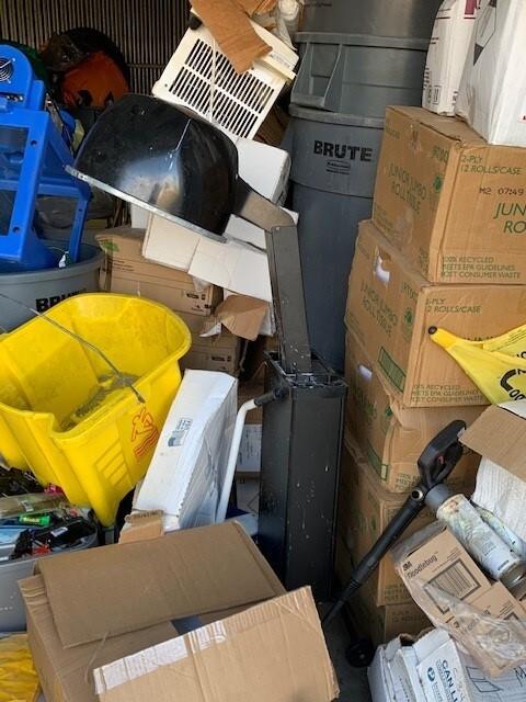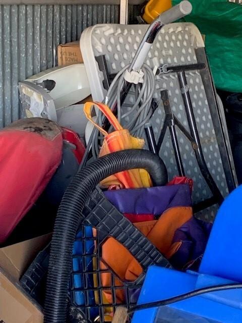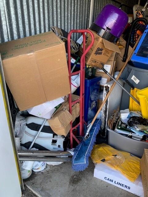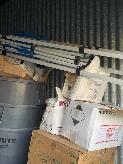 This unit appears to contain…bags, boxes, dolly, popcorn machine, trash can, tent, a/c window unit, standing hair dryer, wet vac, tables, dust pan vacuum, cleaning supplies