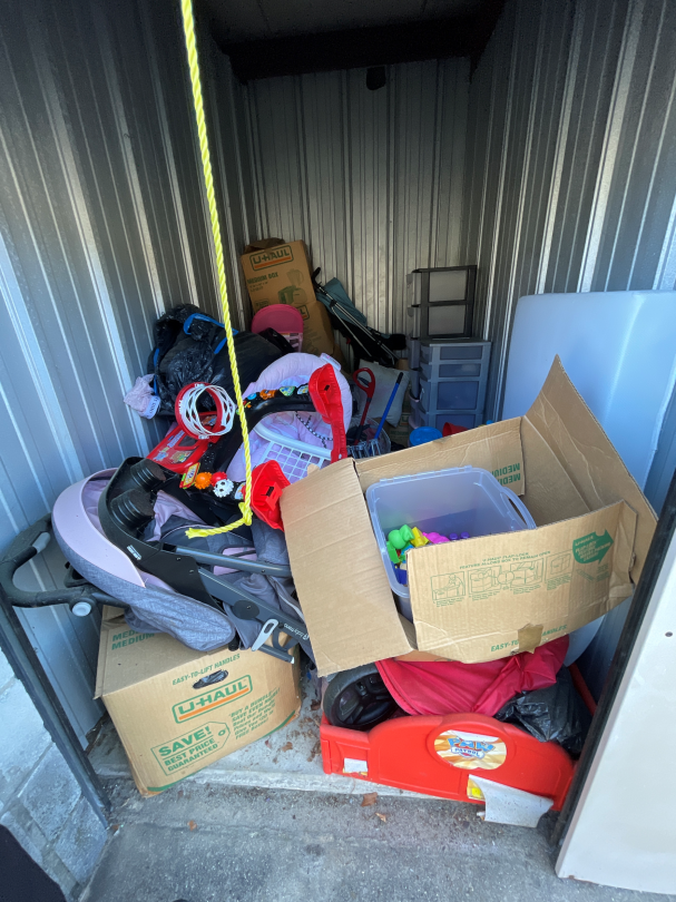 This unit appears to contain…Strollers, boxes, toys, baby items, totes